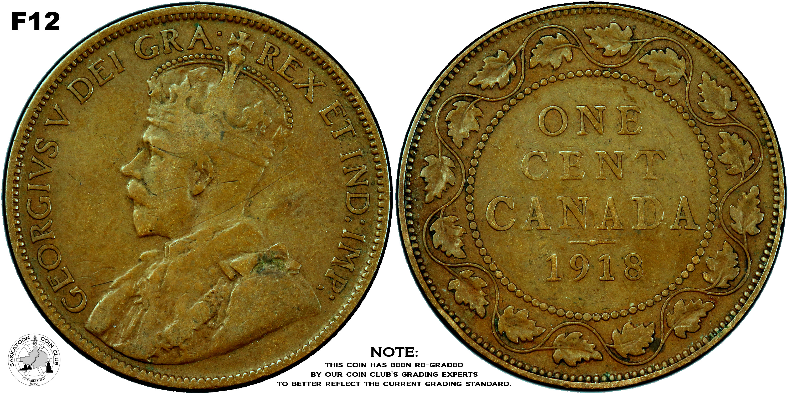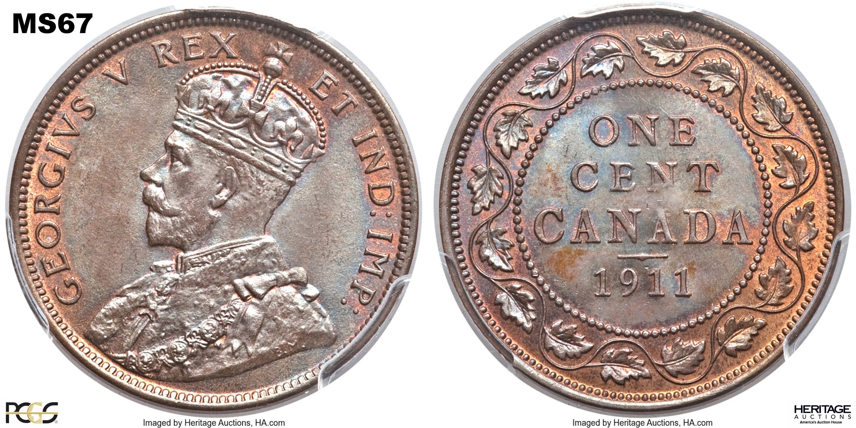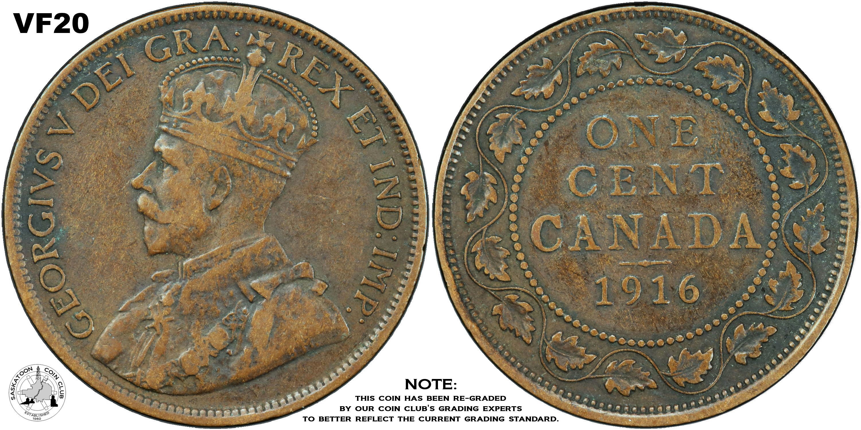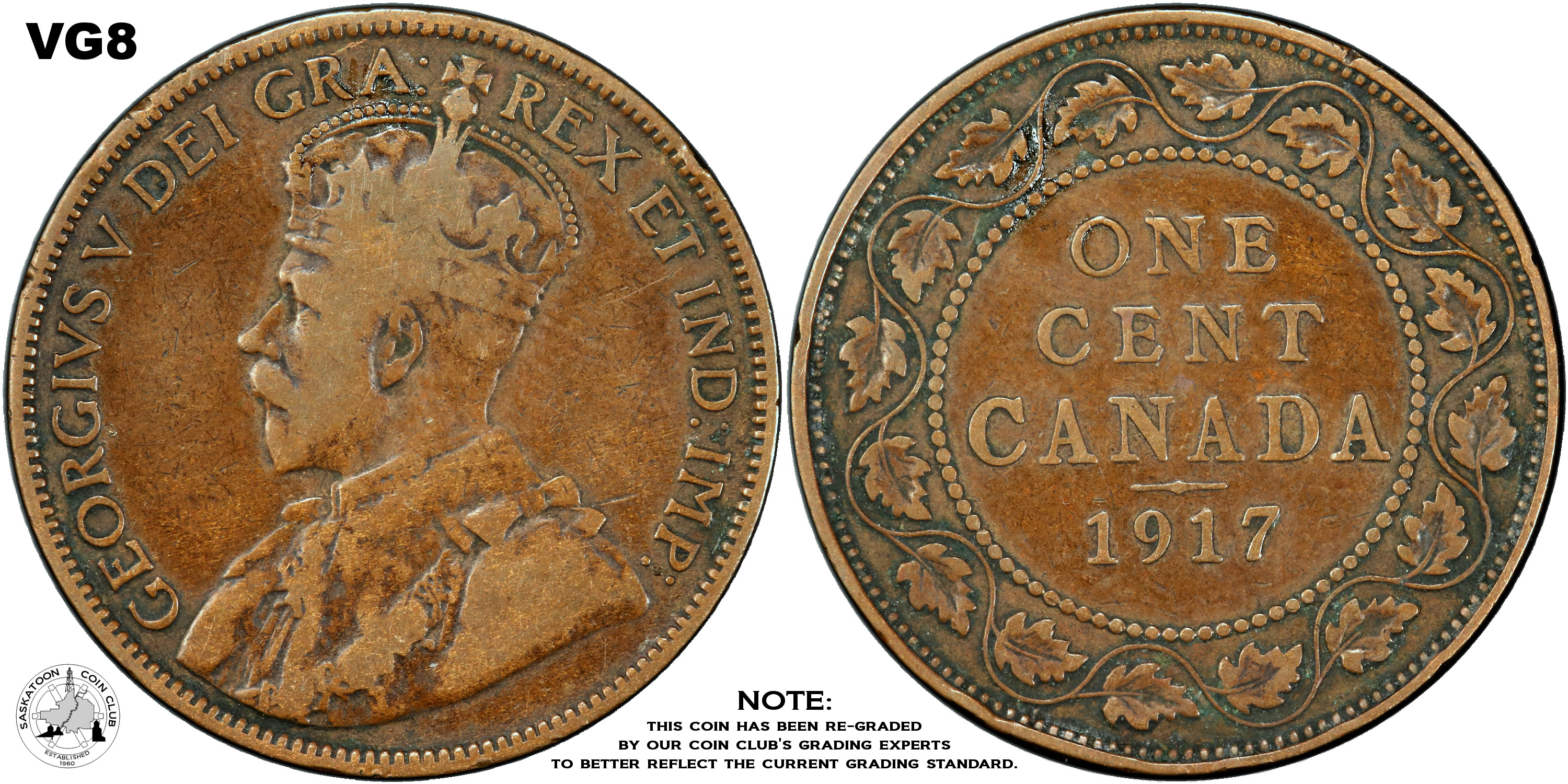 This page describes the criteria used to assign grades to "large cent" 1 cent Canadian circulation coins issued between 1911 and 1920, which use the portrait of King George V. It also shows sample images of each grade. All photos used here were taken of coins that have been professionally graded by companies like PCGS, NGC, ICCS, CCCS, ANACS, or ICG. NOTE: Click on any photo to load a much larger version of both the obverse and reverse sides of the graded coin. Once that photo has loaded on screen, if you click it again you will see a huge photo which allows you to see every fine detail. |