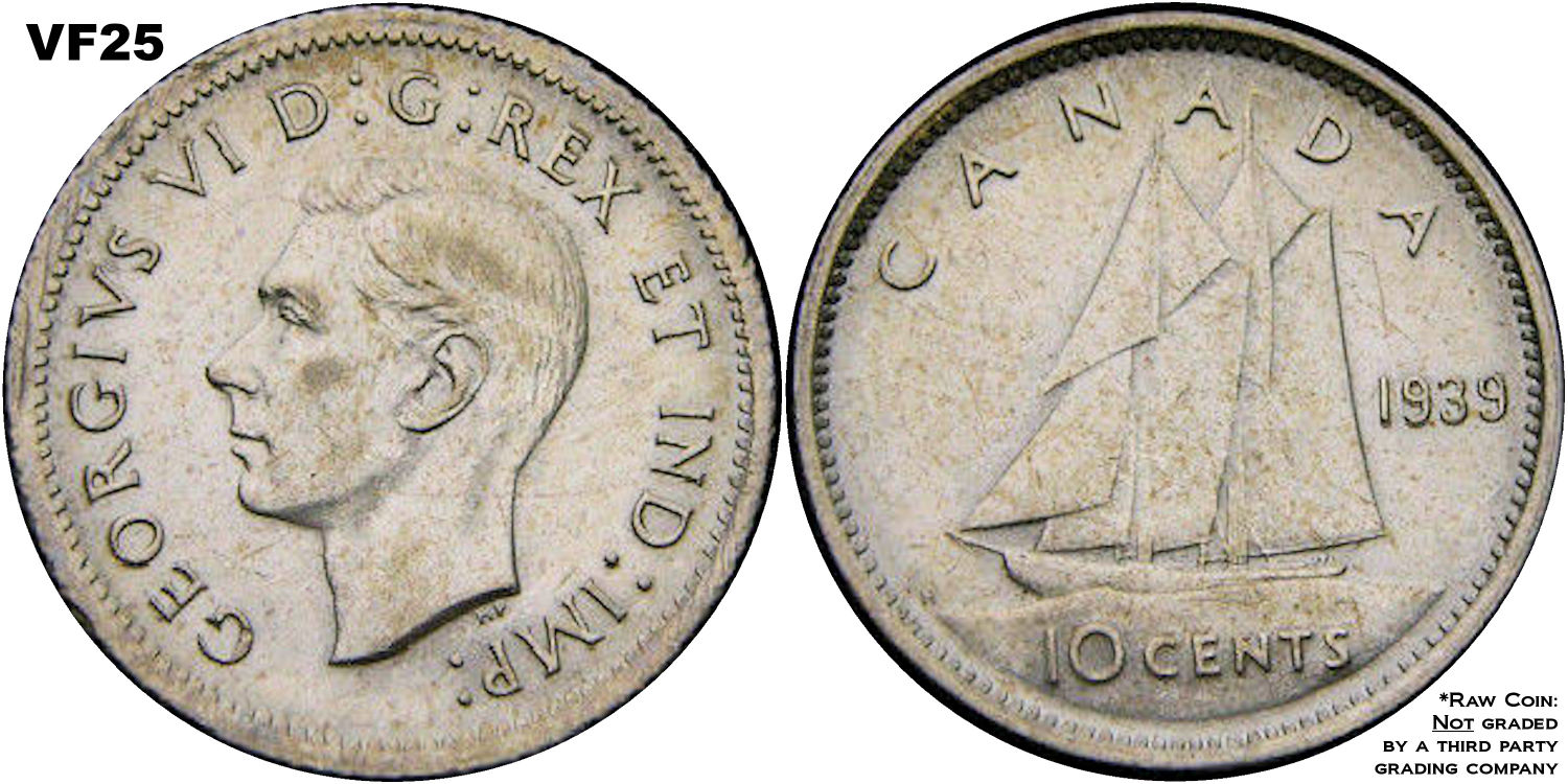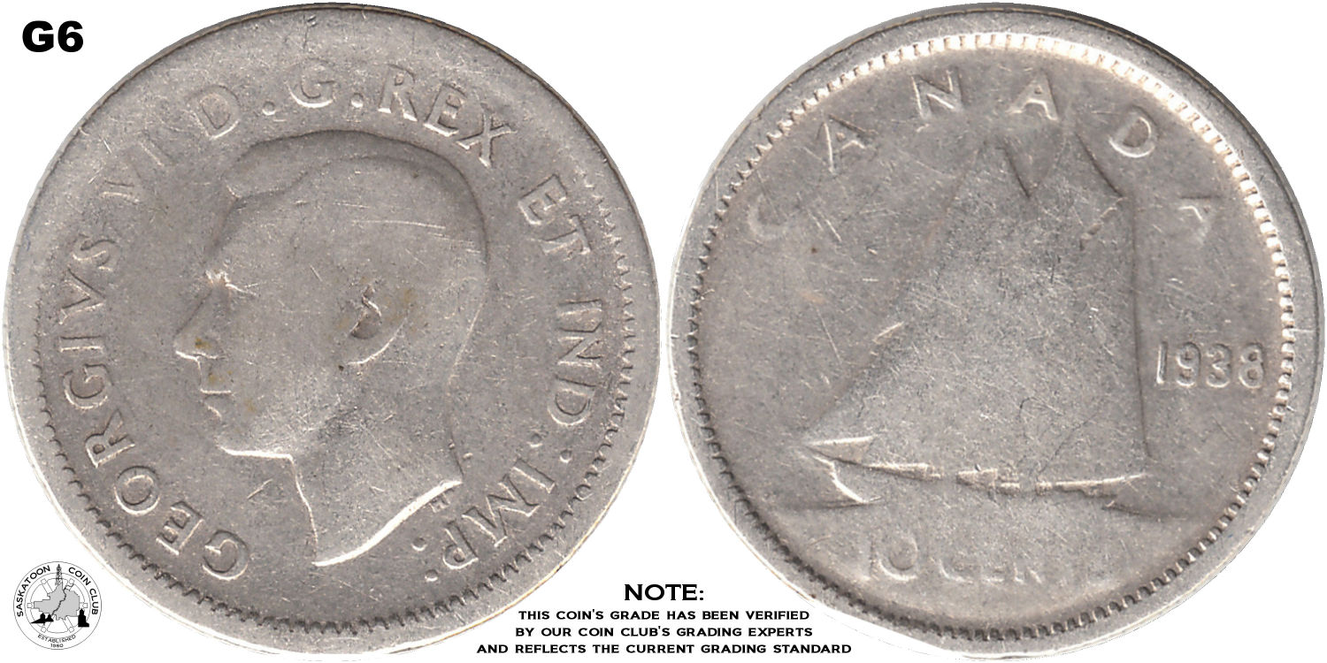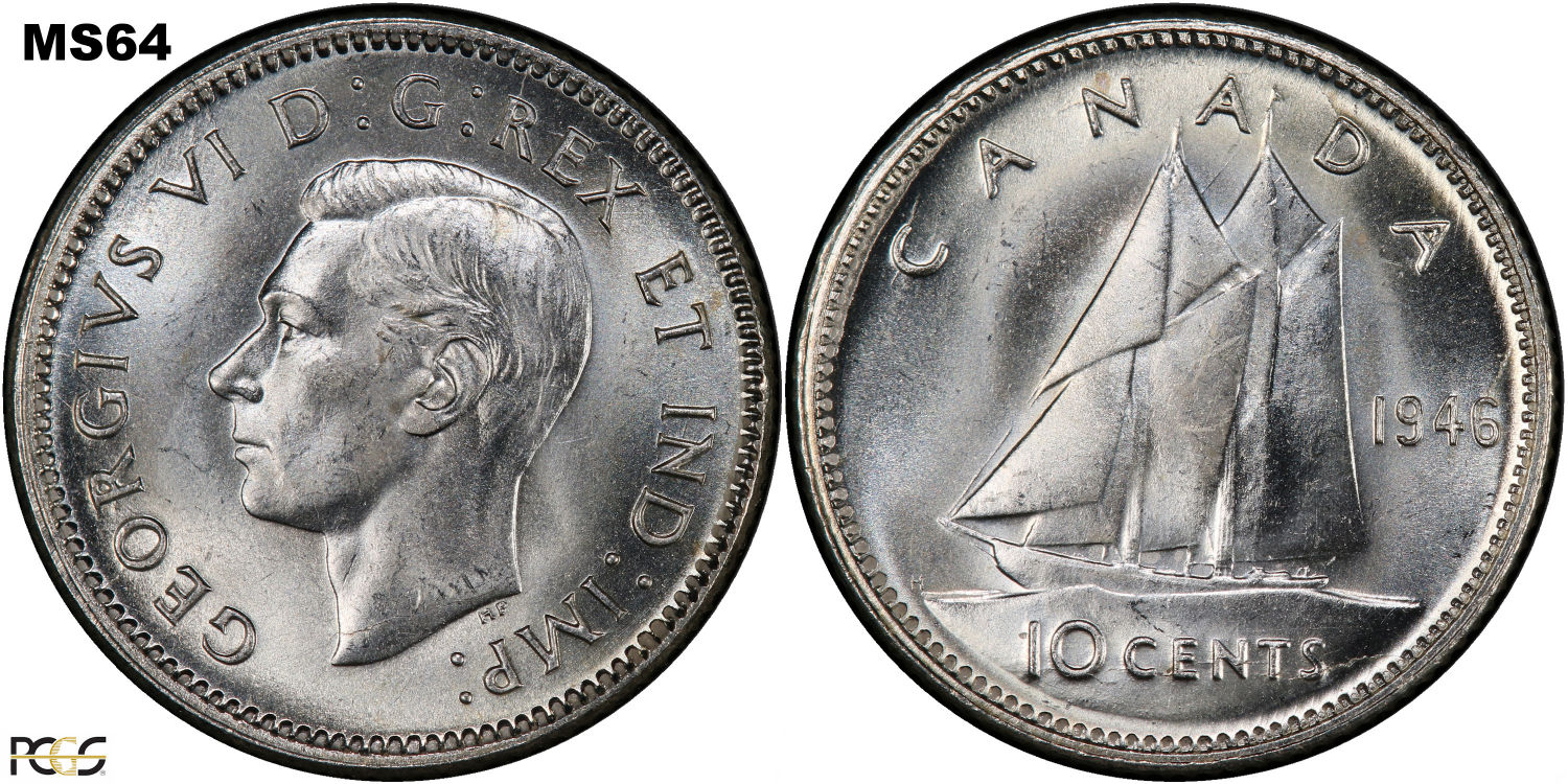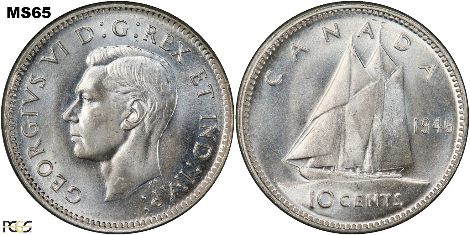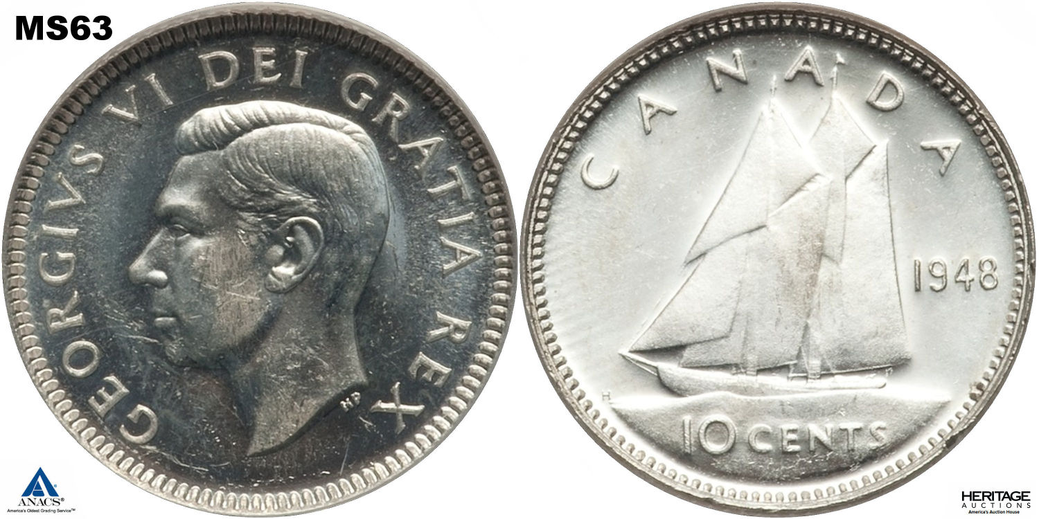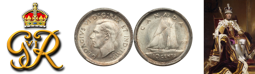 This page describes the criteria used to assign grades to 10 cent Canadian circulation coins which use the portrait of King George VI, issued between 1937 and 1952. It also shows sample images of each grade. All photos used here were taken of coins that have been professionally graded by companies like PCGS, NGC, ICCS, CCCS, ANACS, or ICG. NOTE: Click on any photo to load a much larger version of both the obverse and reverse sides of the graded coin. Once that photo has loaded on screen, if you click it again you will see a huge photo which allows you to see every fine detail. |