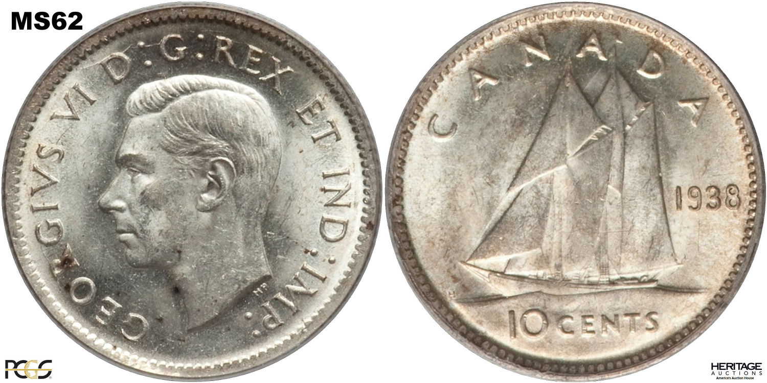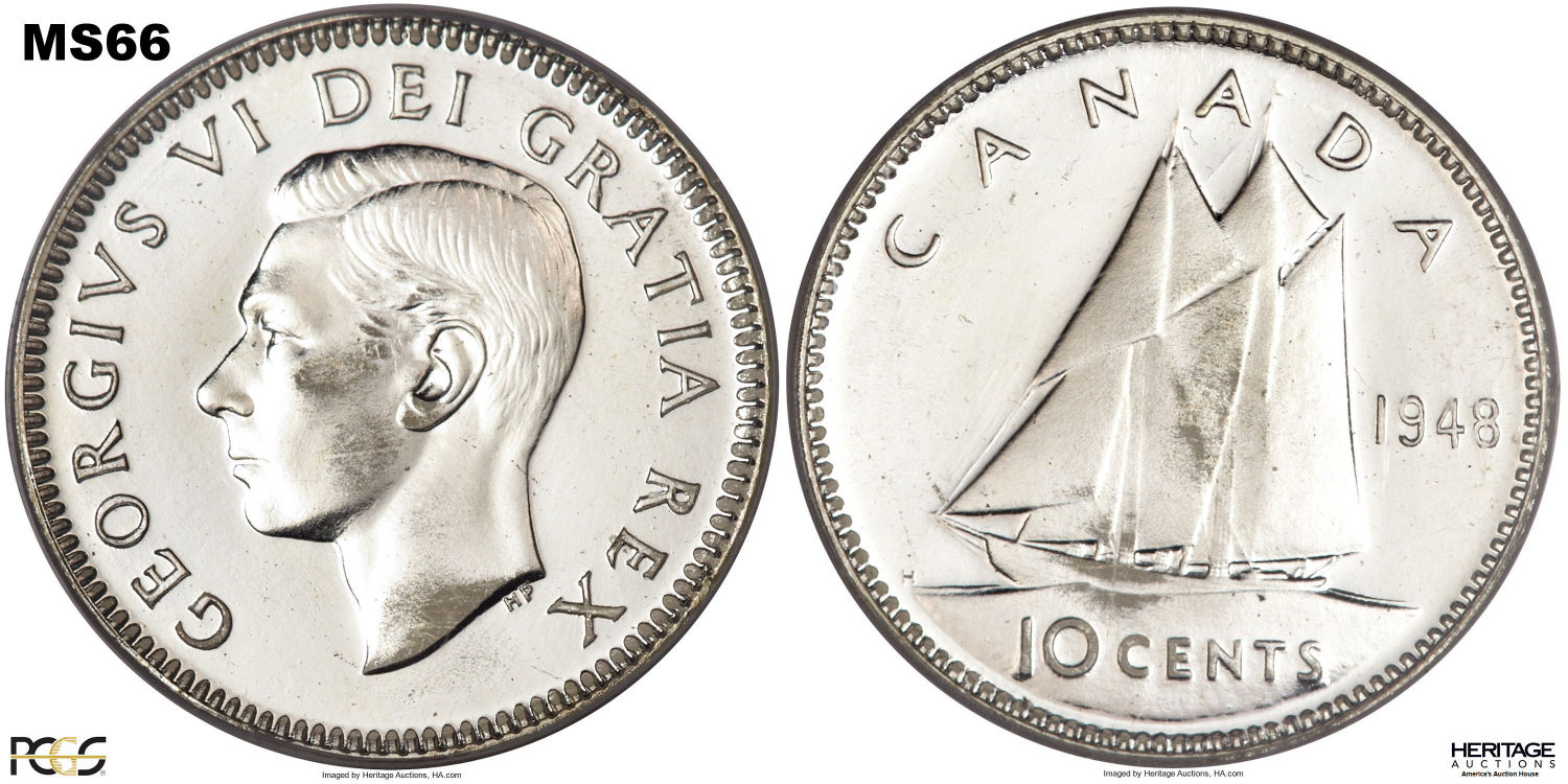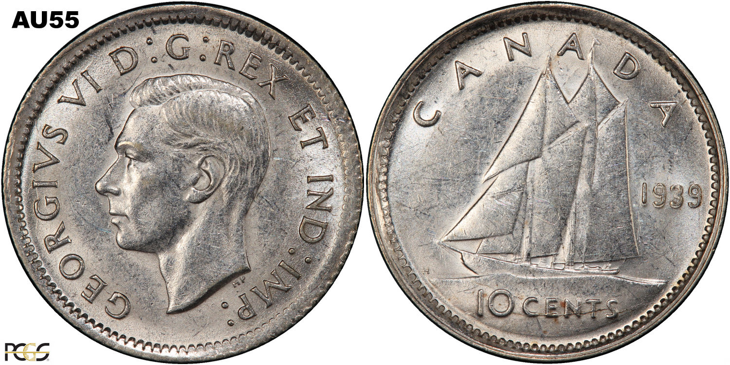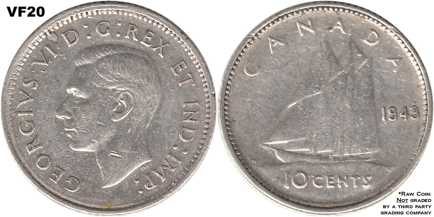 This page describes the criteria used to assign grades to 10 cent Canadian circulation coins which use the portrait of King George VI, issued between 1937 and 1952. It also shows sample images of each grade. All photos used here were taken of coins that have been professionally graded by companies like PCGS, NGC, ICCS, CCCS, ANACS, or ICG. NOTE: Click on any photo to load a much larger version of both the obverse and reverse sides of the graded coin. Once that photo has loaded on screen, if you click it again you will see a huge photo which allows you to see every fine detail. |