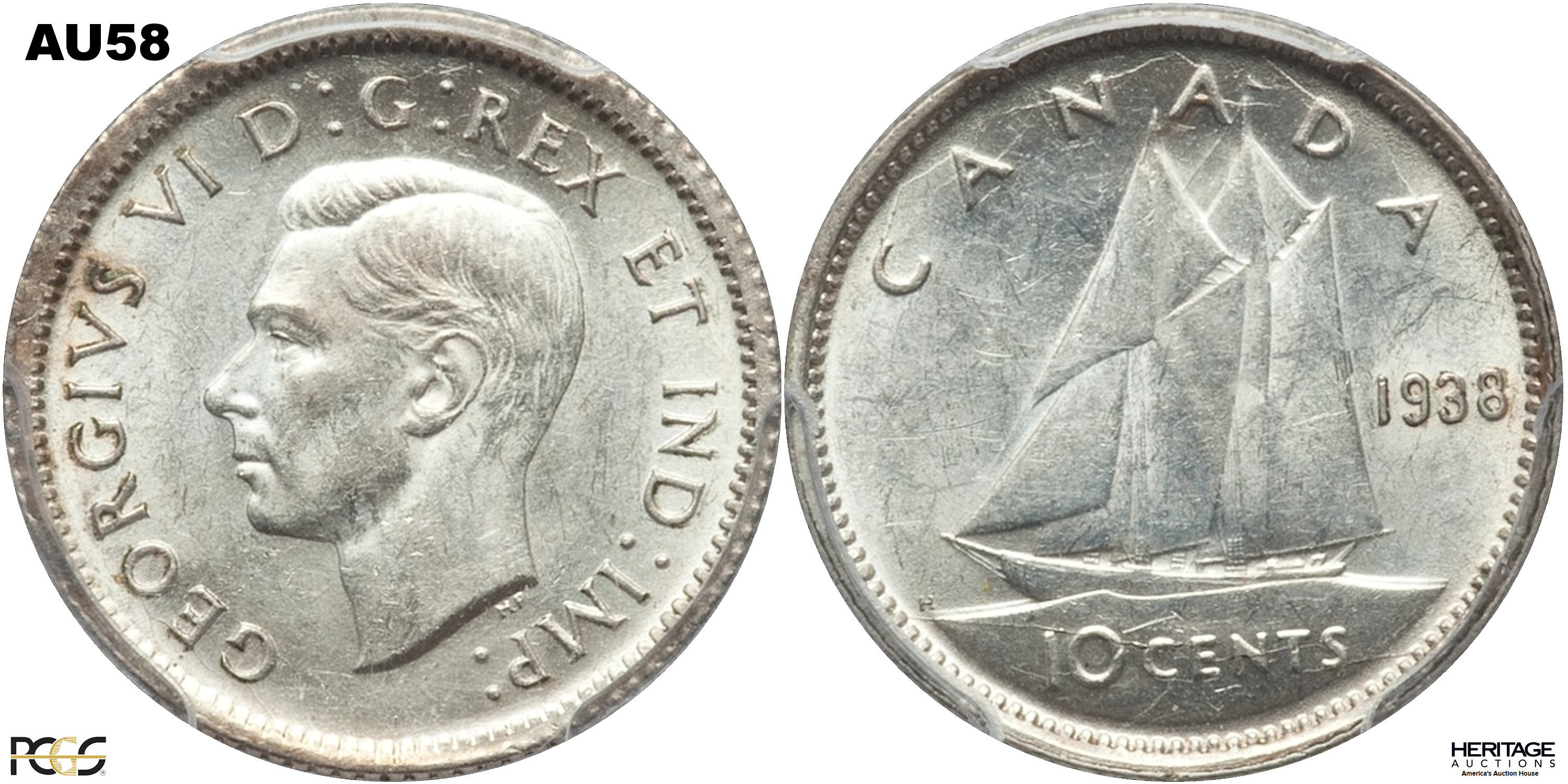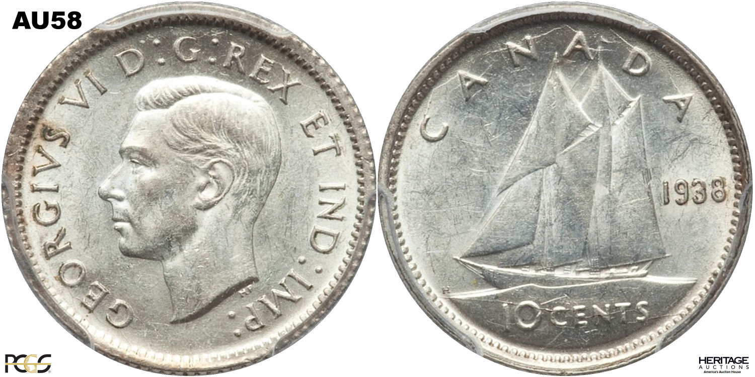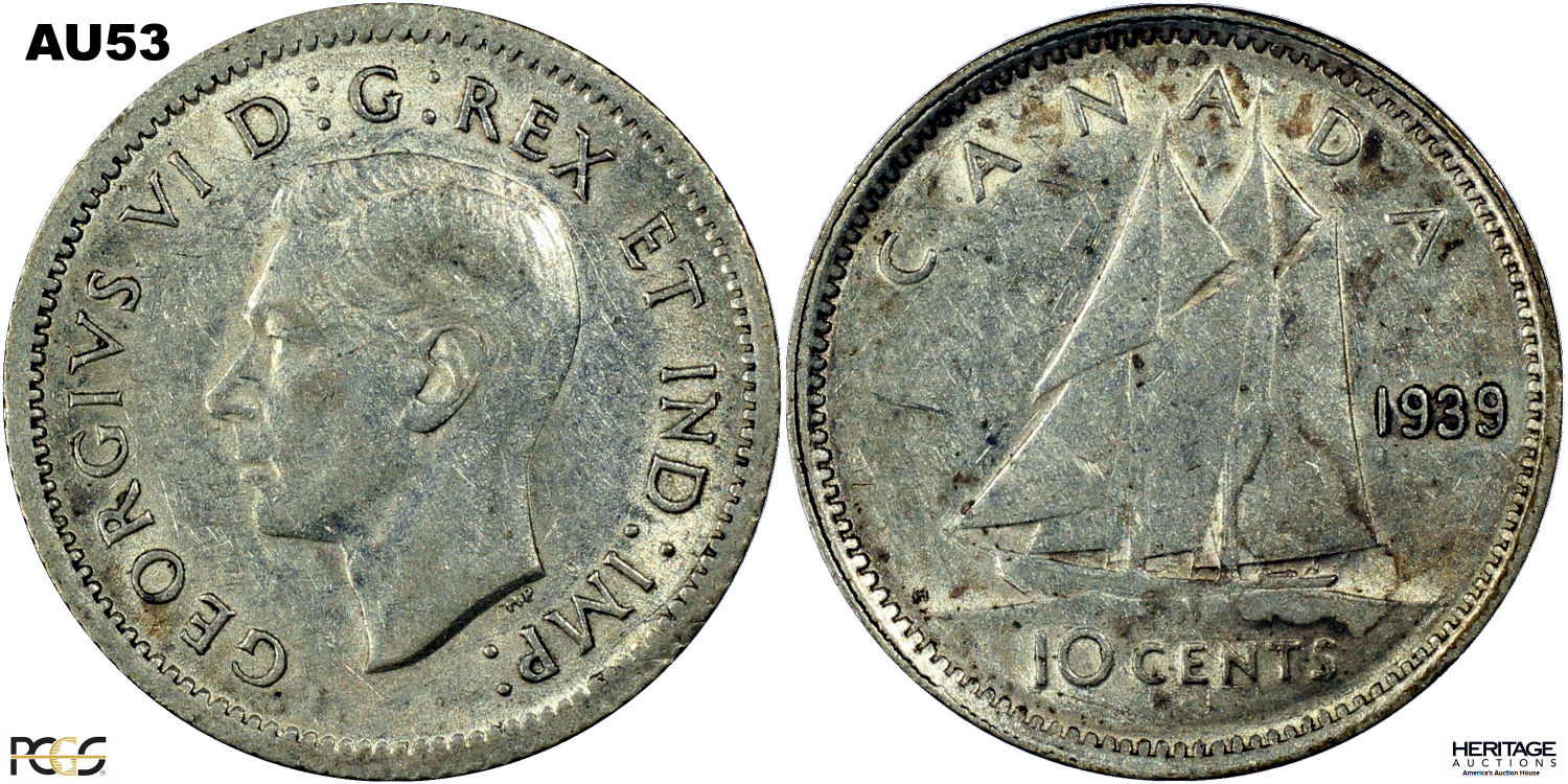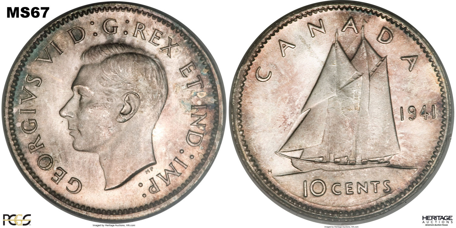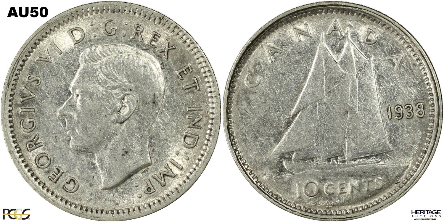This page describes the criteria used to assign grades to 10 cent Canadian circulation coins which use the portrait of King George VI, issued between 1937 and 1952. It also shows sample images of each grade. All photos used here were taken of coins that have been professionally graded by companies like PCGS, NGC, ICCS, CCCS, ANACS, or ICG. NOTE: Click on any photo to load a much larger version of both the obverse and reverse sides of the graded coin. Once that photo has loaded on screen, if you click it again you will see a huge photo which allows you to see every fine detail. |