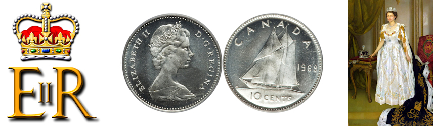 This page describes the criteria used to assign grades to 10 cent Canadian circulation coins which use the portrait of Elizabeth II between 1965 and 1981. It also shows sample images of each grade. All photos used here were taken of coins that have been professionally graded by companies like PCGS. NOTE: Click on any photo to load a much larger version of both the obverse and reverse sides of the graded coin |