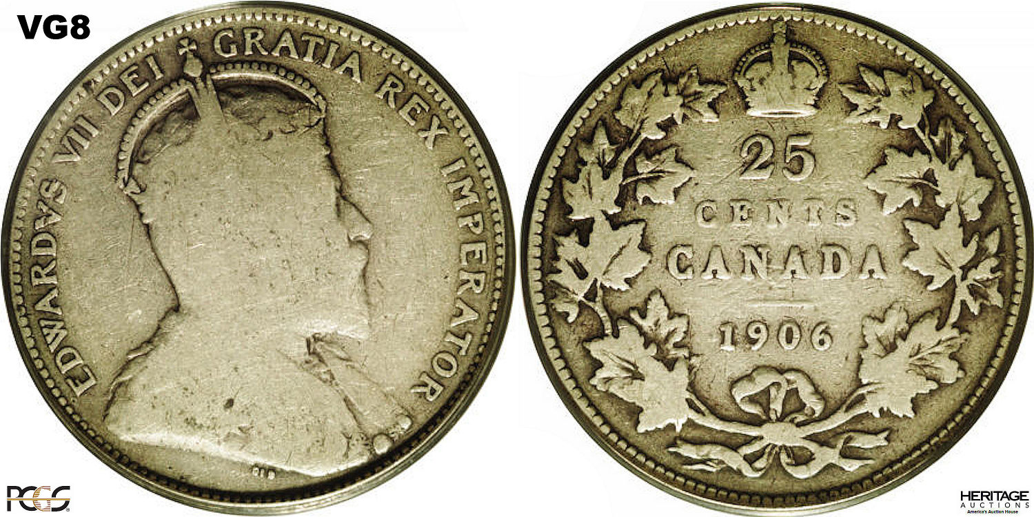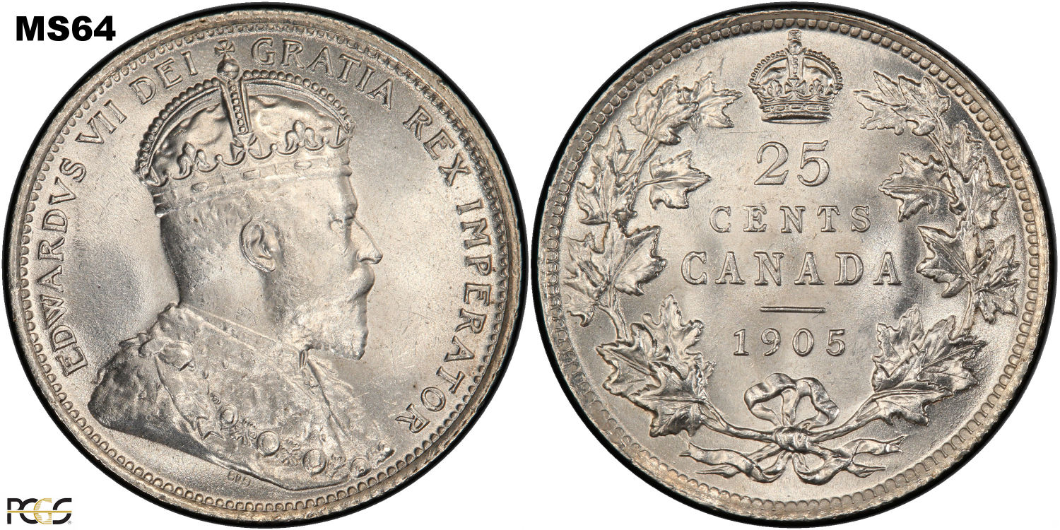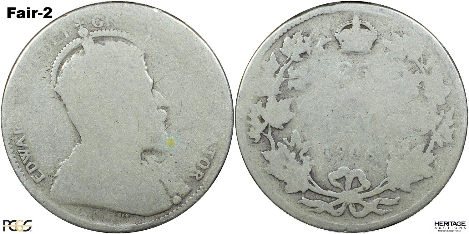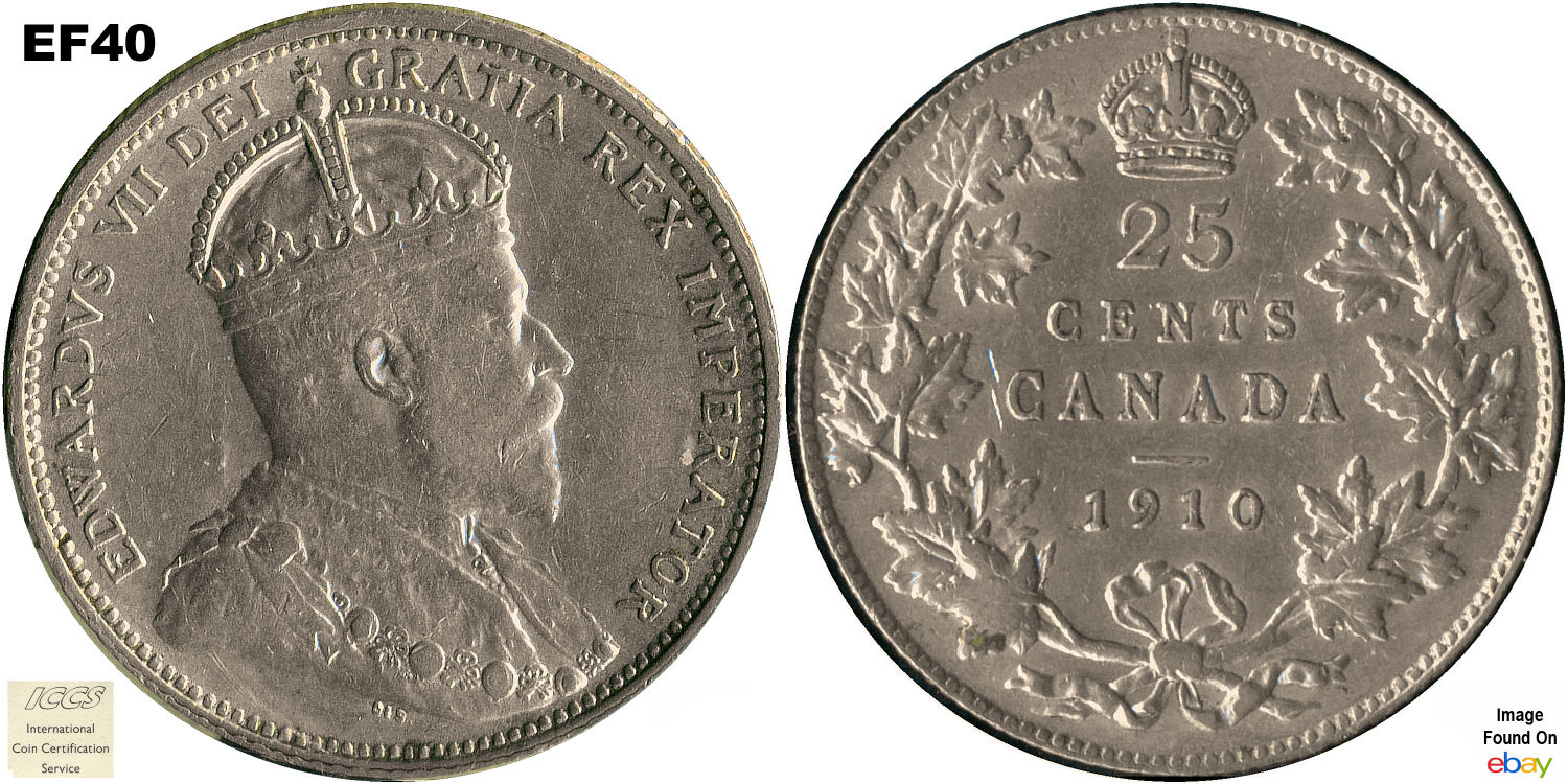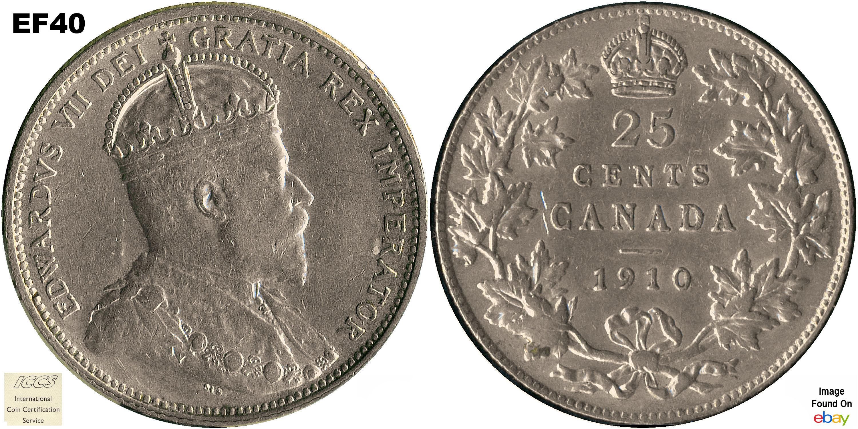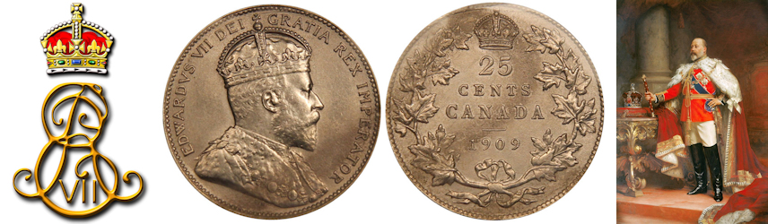 This page describes the criteria used to assign grades to 25 cent Canadian circulation coins issued between 1902 and 1910, which use the portrait of King Edward VII. It also shows sample images of each grade. All photos used here were taken of coins that have been professionally graded by companies like PCGS, NGC, ICCS, CCCS, ANACS, or ICG. NOTE: Click on any photo to load a much larger version of both the obverse and reverse sides of the graded coin. Once that photo has loaded on screen, if you click it again you will see a huge photo which allows you to see every fine detail. |
