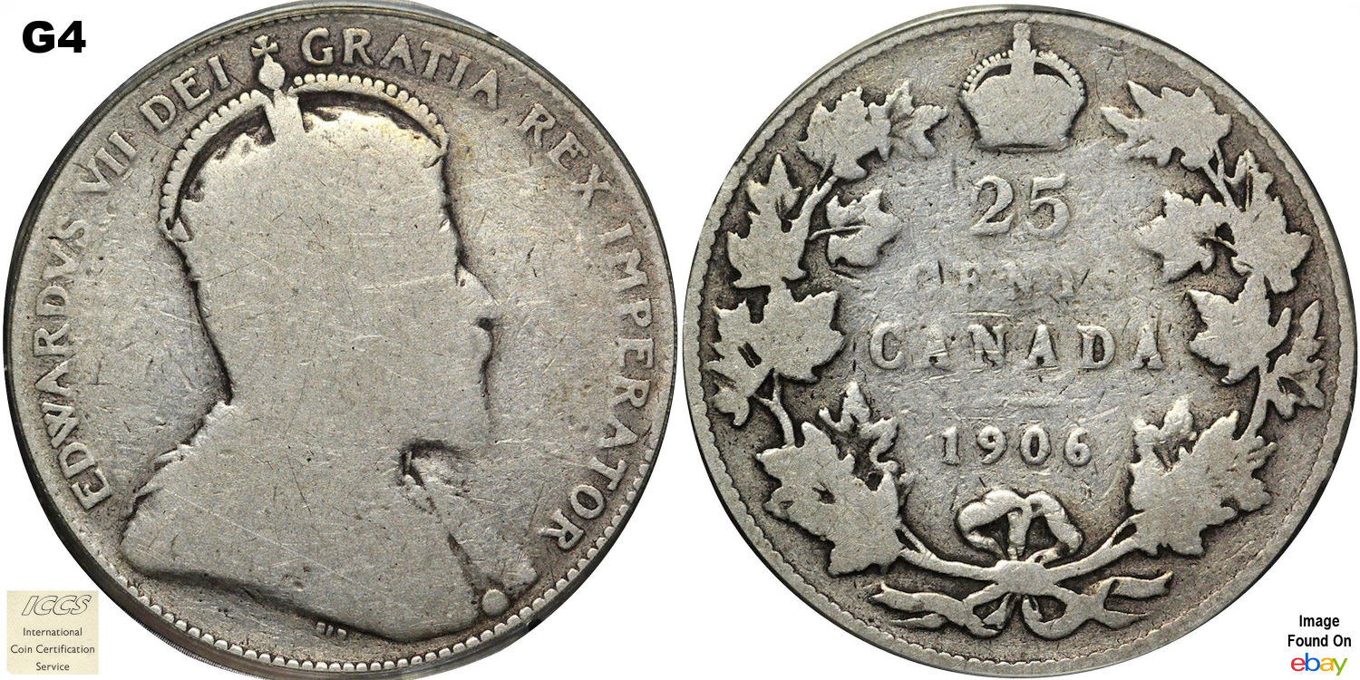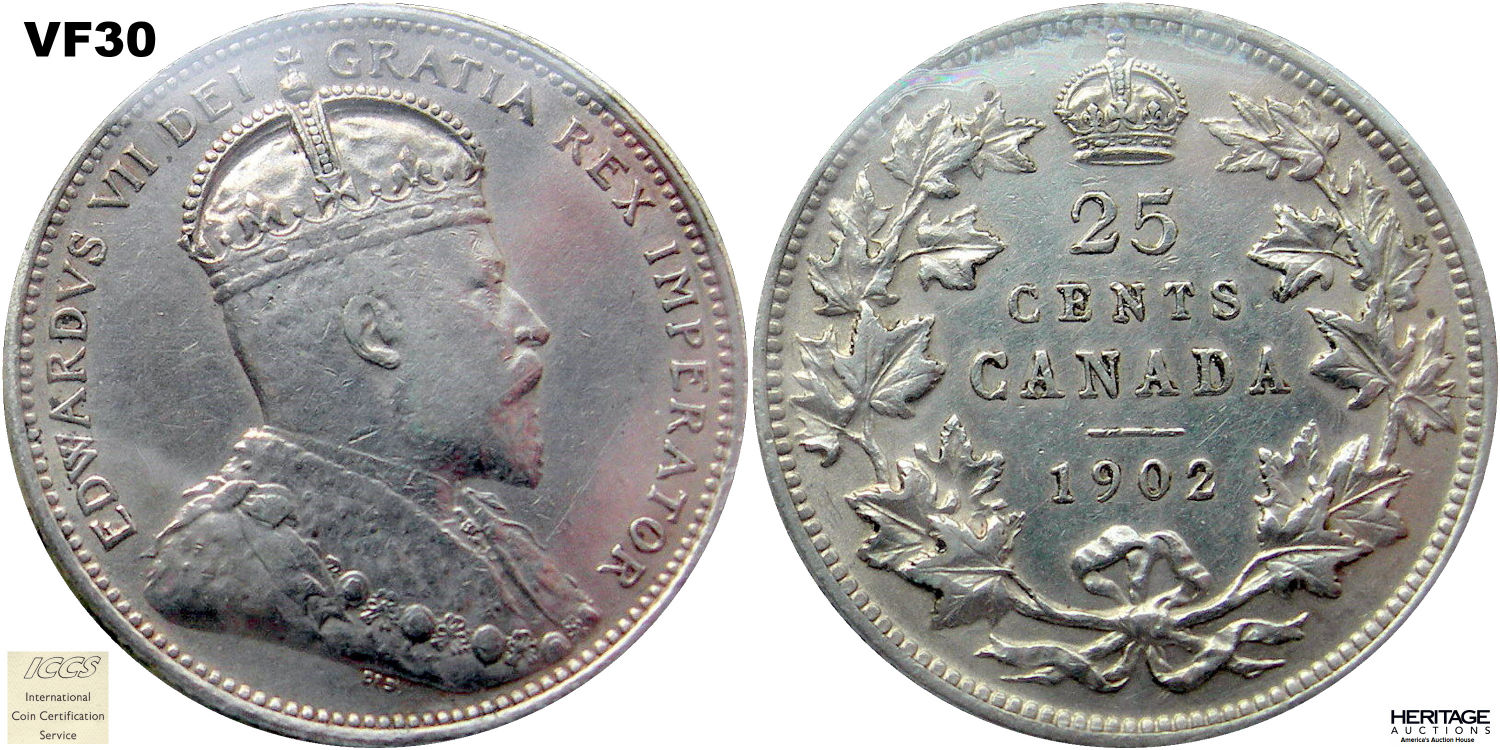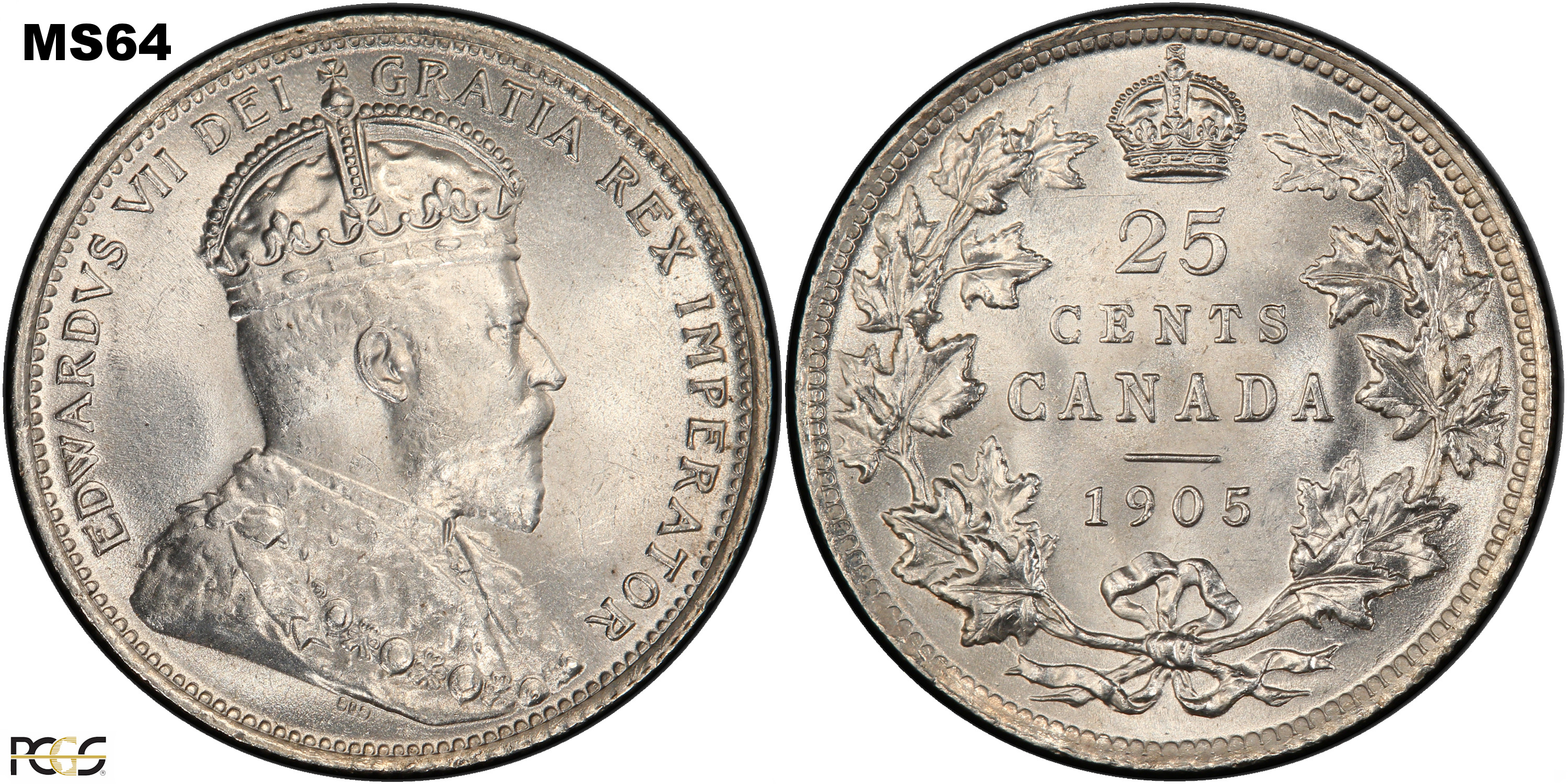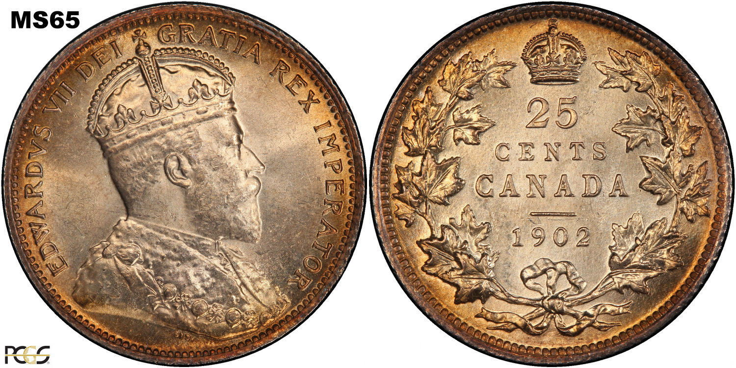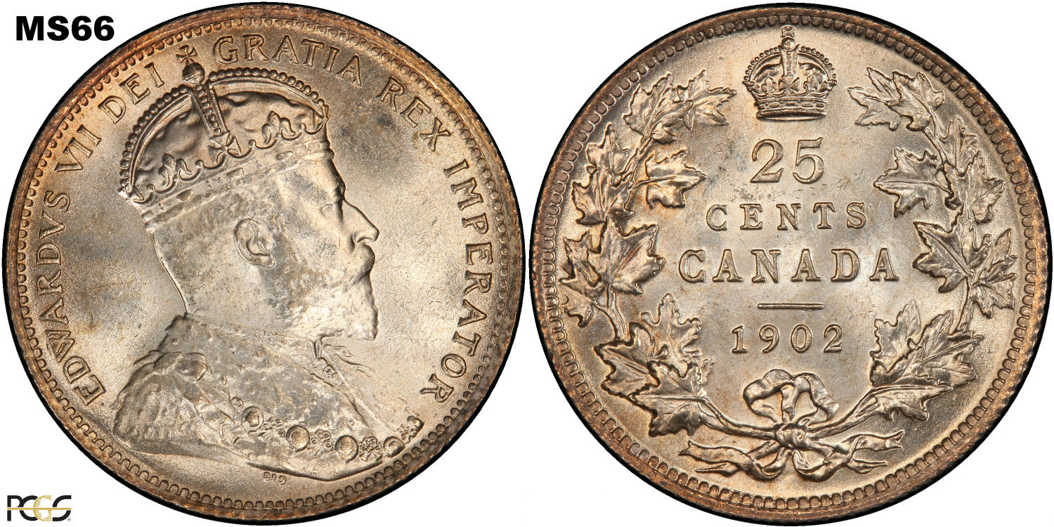 This page describes the criteria used to assign grades to 25 cent Canadian circulation coins issued between 1902 and 1910, which use the portrait of King Edward VII. It also shows sample images of each grade. All photos used here were taken of coins that have been professionally graded by companies like PCGS, NGC, ICCS, CCCS, ANACS, or ICG. NOTE: Click on any photo to load a much larger version of both the obverse and reverse sides of the graded coin. Once that photo has loaded on screen, if you click it again you will see a huge photo which allows you to see every fine detail. |