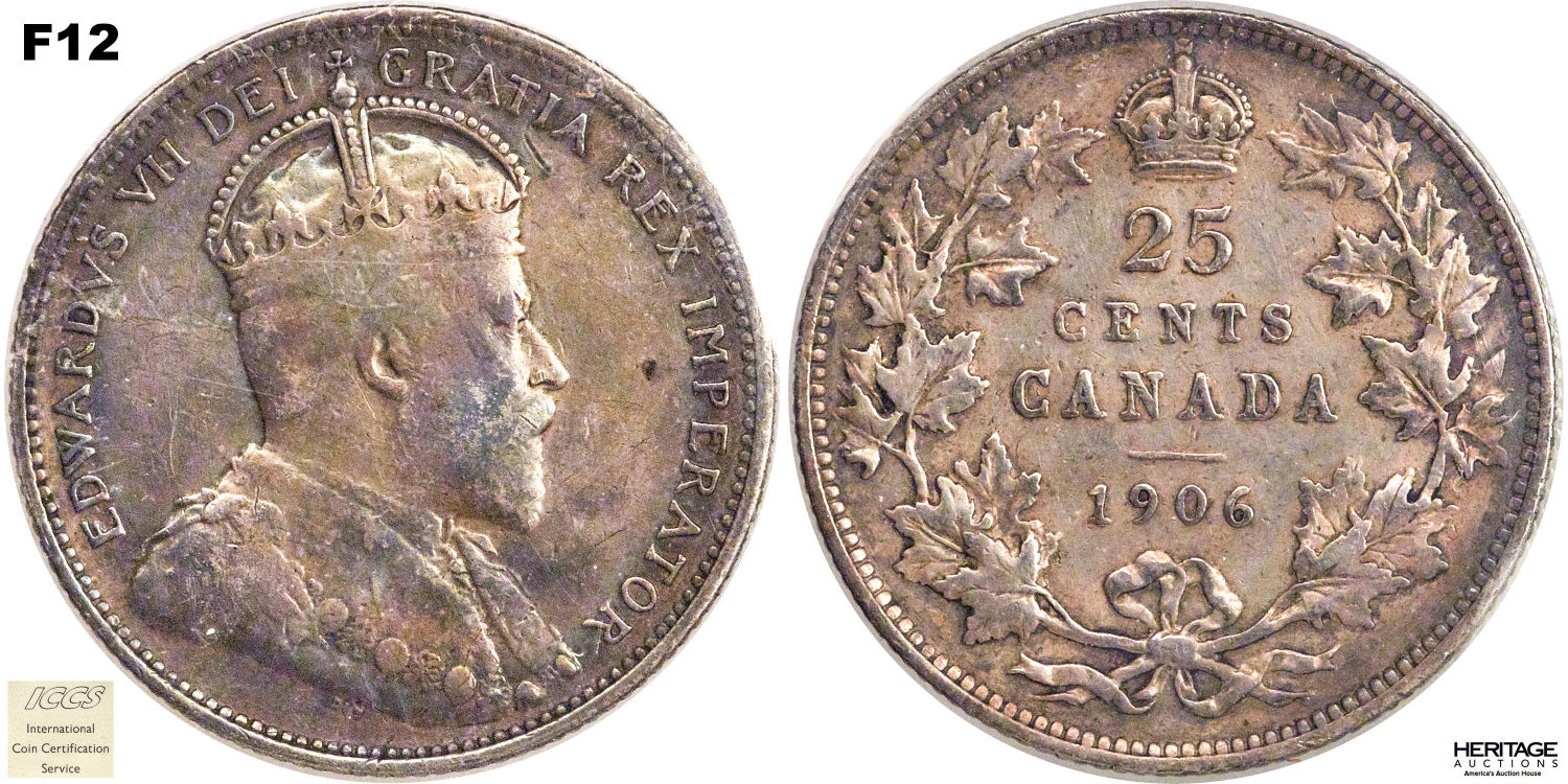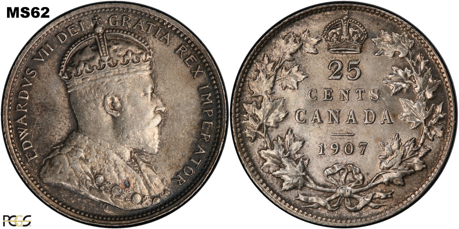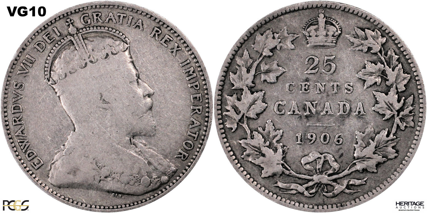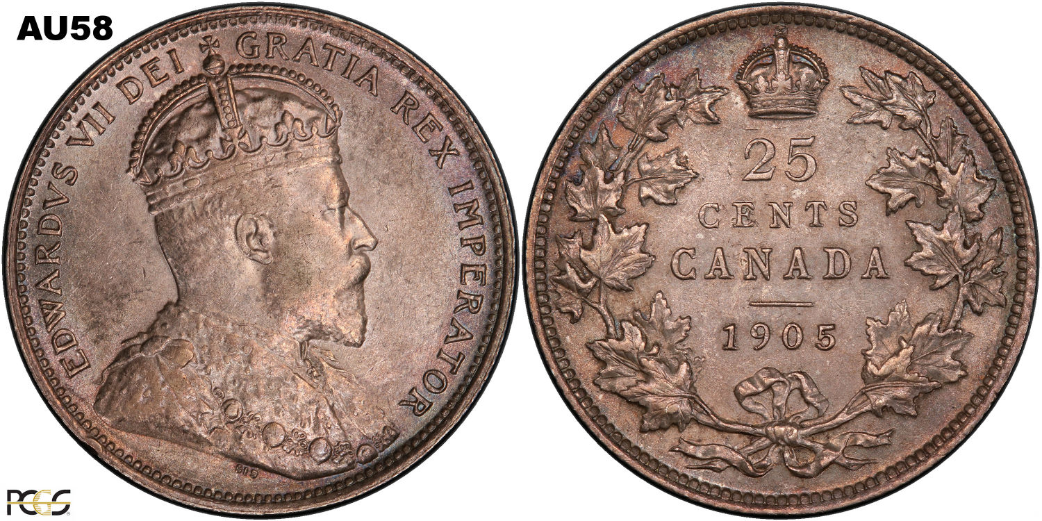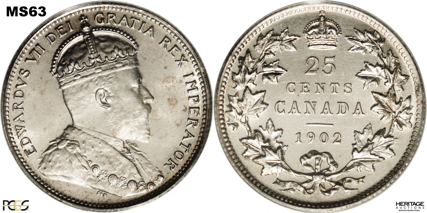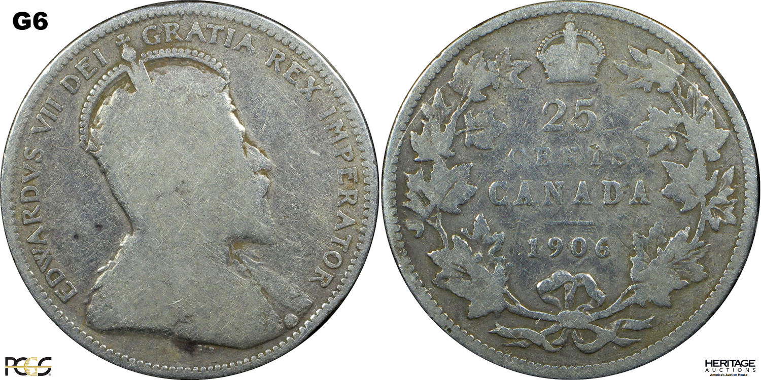 This page describes the criteria used to assign grades to 25 cent Canadian circulation coins issued between 1902 and 1910, which use the portrait of King Edward VII. It also shows sample images of each grade. All photos used here were taken of coins that have been professionally graded by companies like PCGS, NGC, ICCS, CCCS, ANACS, or ICG. NOTE: Click on any photo to load a much larger version of both the obverse and reverse sides of the graded coin. Once that photo has loaded on screen, if you click it again you will see a huge photo which allows you to see every fine detail. |