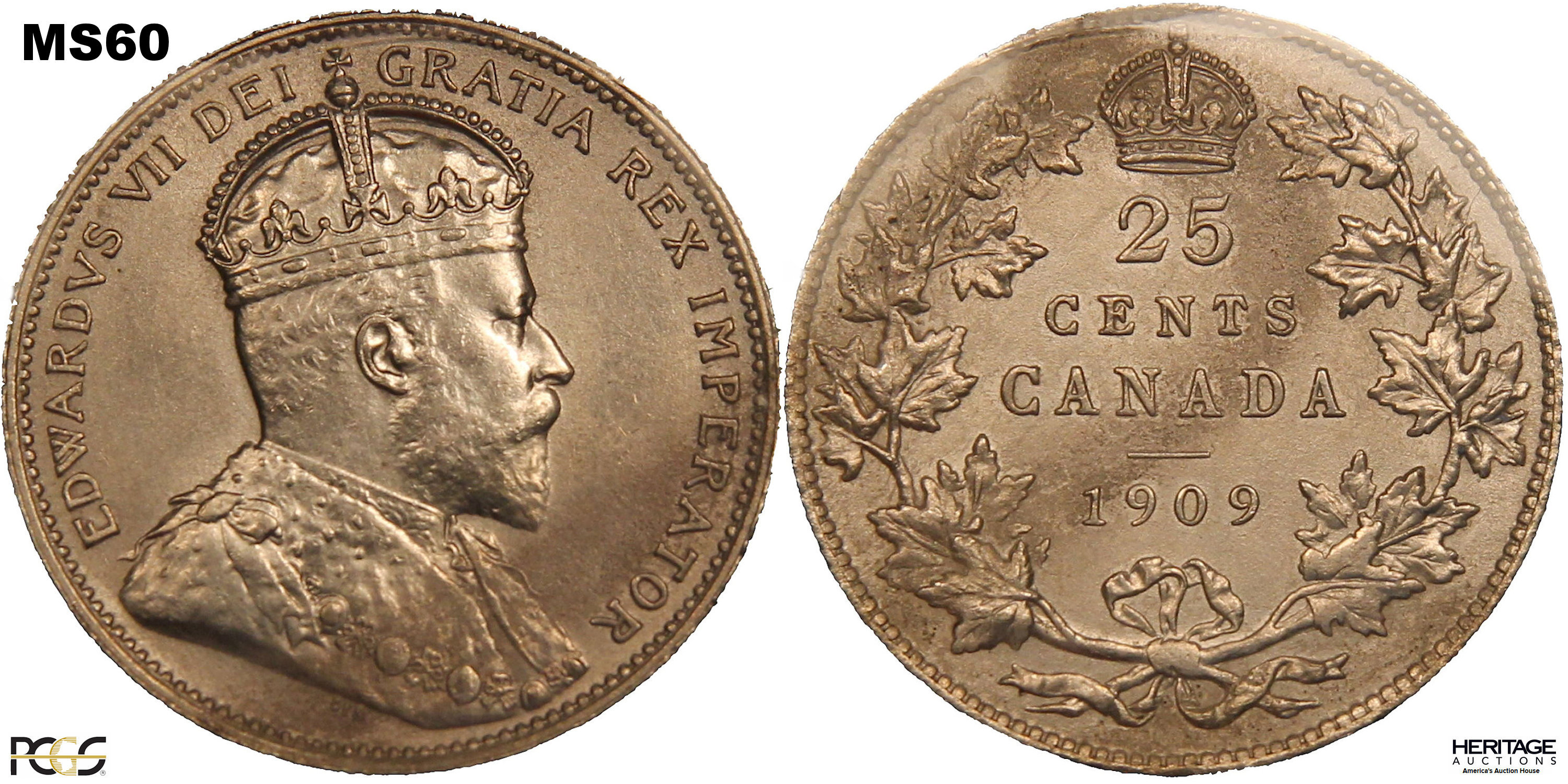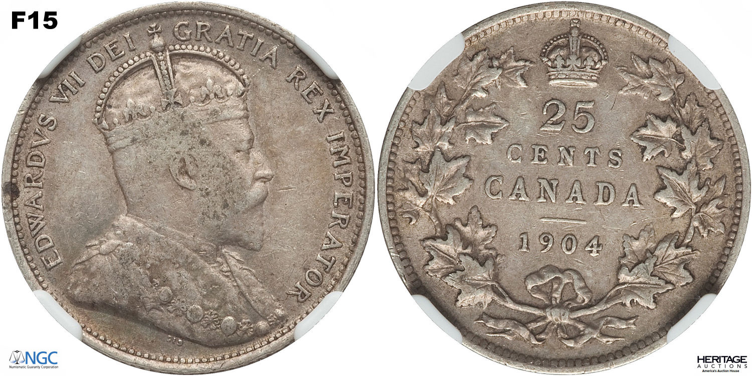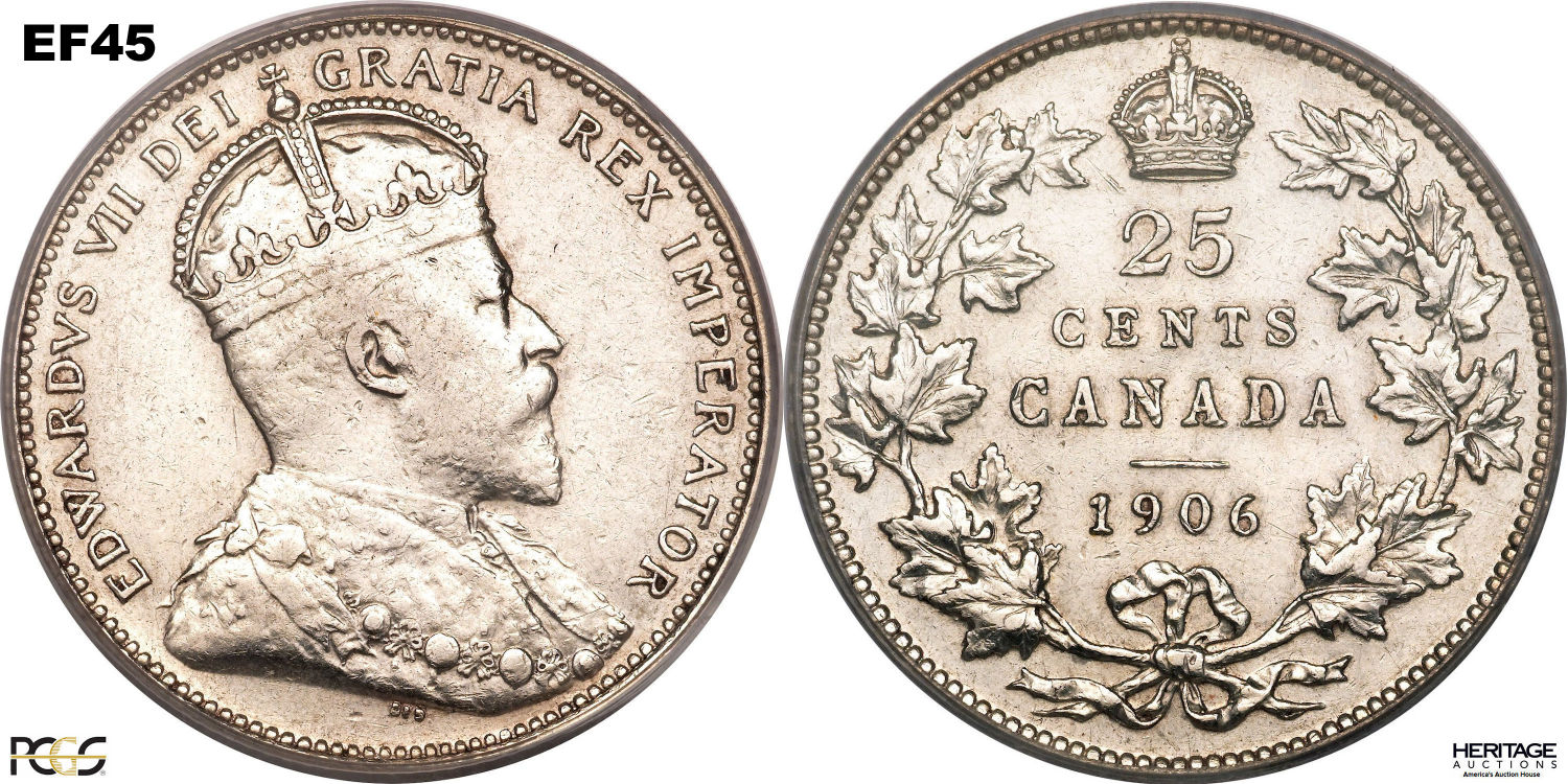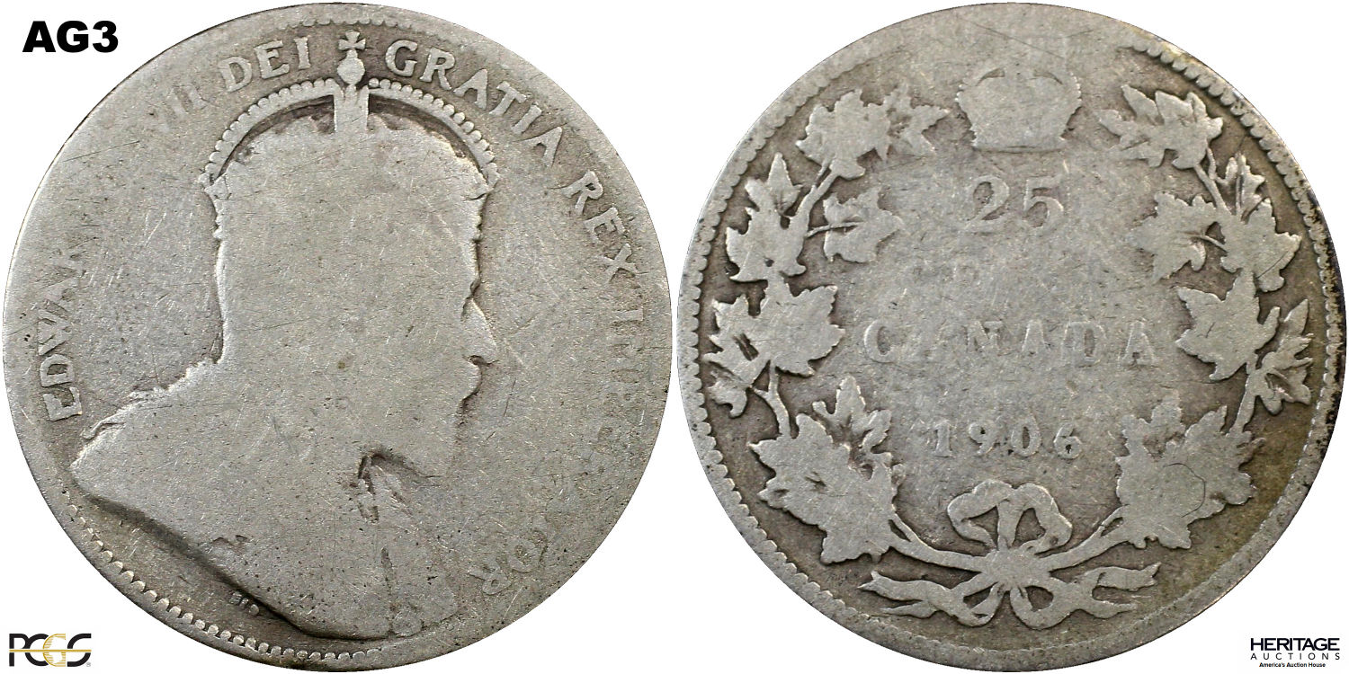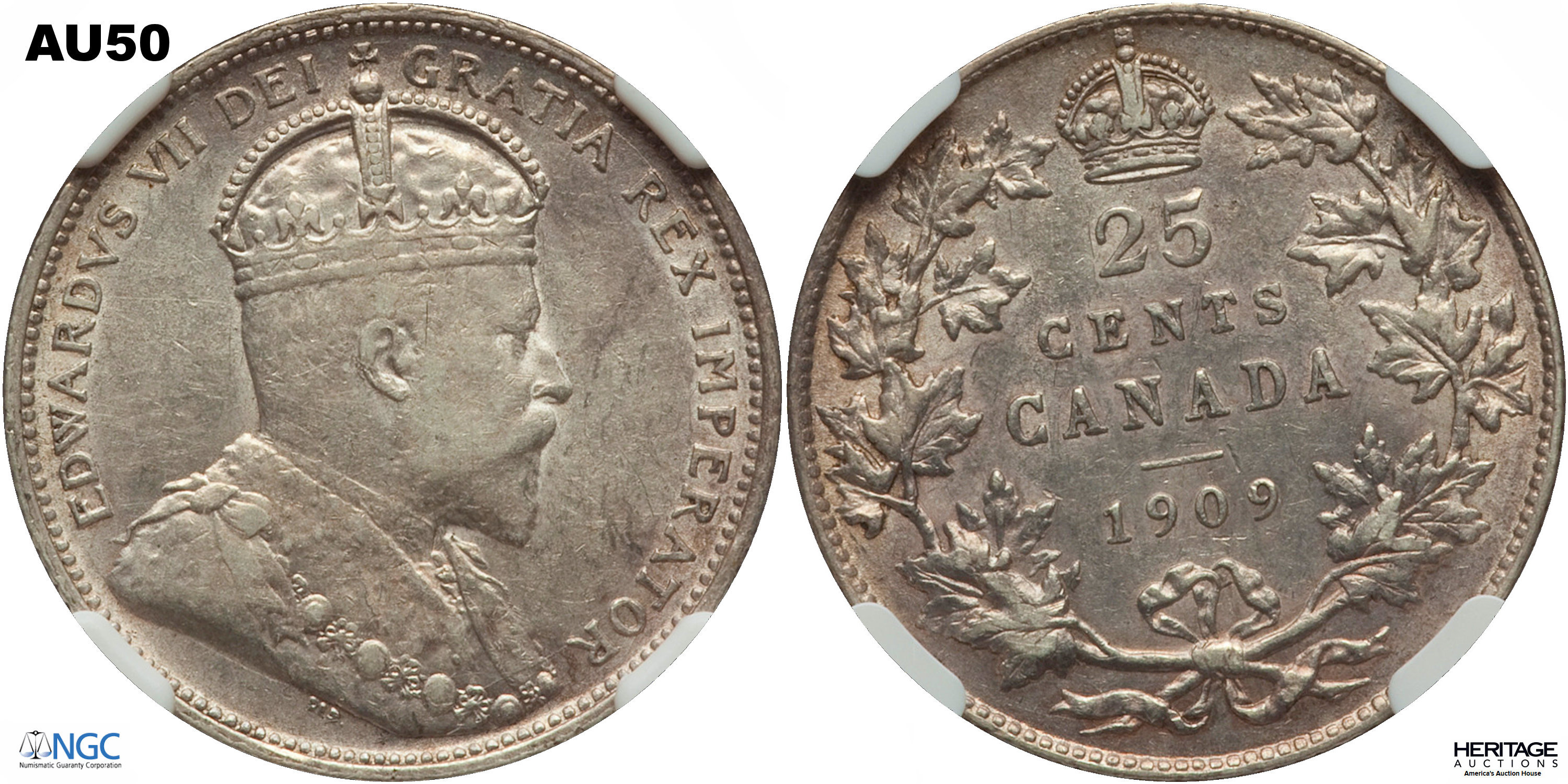 This page describes the criteria used to assign grades to 25 cent Canadian circulation coins issued between 1902 and 1910, which use the portrait of King Edward VII. It also shows sample images of each grade. All photos used here were taken of coins that have been professionally graded by companies like PCGS, NGC, ICCS, CCCS, ANACS, or ICG. NOTE: Click on any photo to load a much larger version of both the obverse and reverse sides of the graded coin. Once that photo has loaded on screen, if you click it again you will see a huge photo which allows you to see every fine detail. |