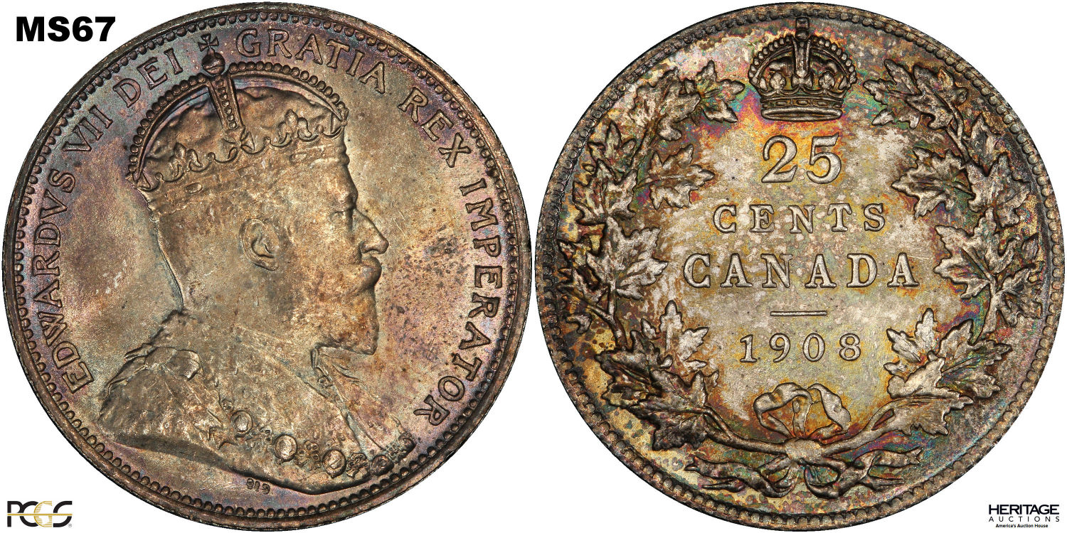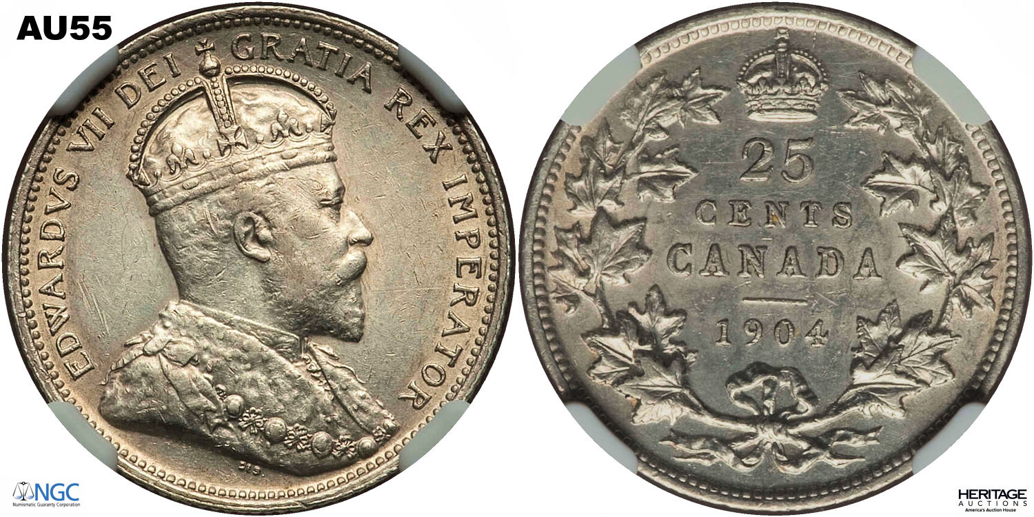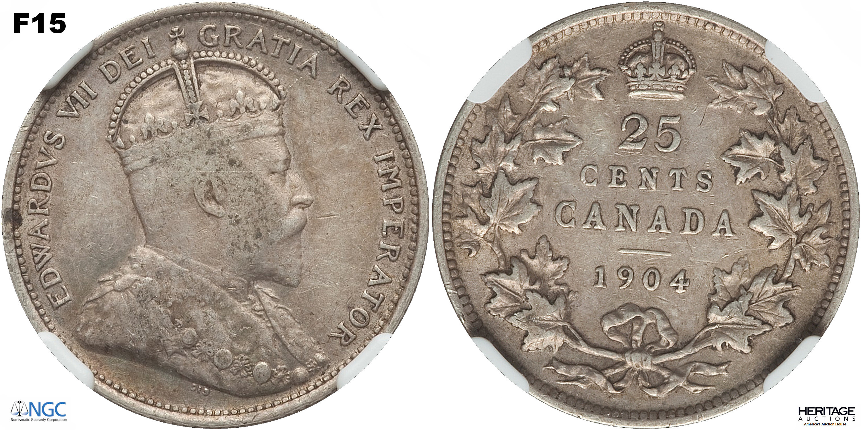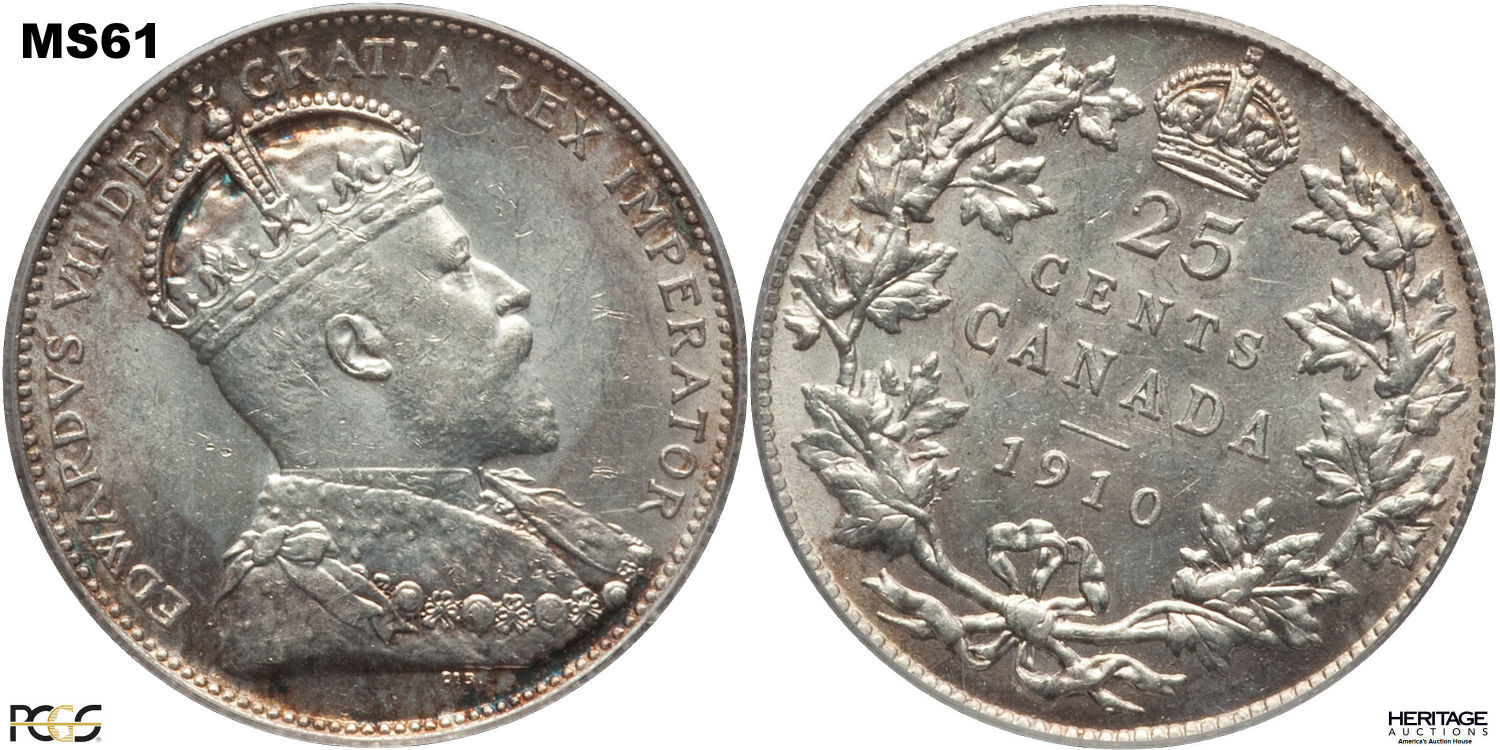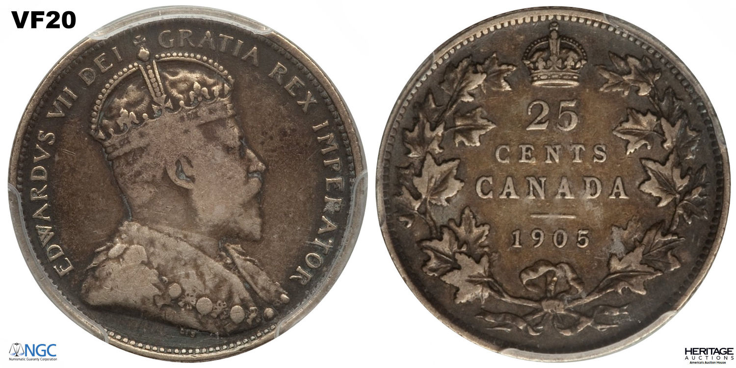 This page describes the criteria used to assign grades to 25 cent Canadian circulation coins issued between 1902 and 1910, which use the portrait of King Edward VII. It also shows sample images of each grade. All photos used here were taken of coins that have been professionally graded by companies like PCGS, NGC, ICCS, CCCS, ANACS, or ICG. NOTE: Click on any photo to load a much larger version of both the obverse and reverse sides of the graded coin. Once that photo has loaded on screen, if you click it again you will see a huge photo which allows you to see every fine detail. |