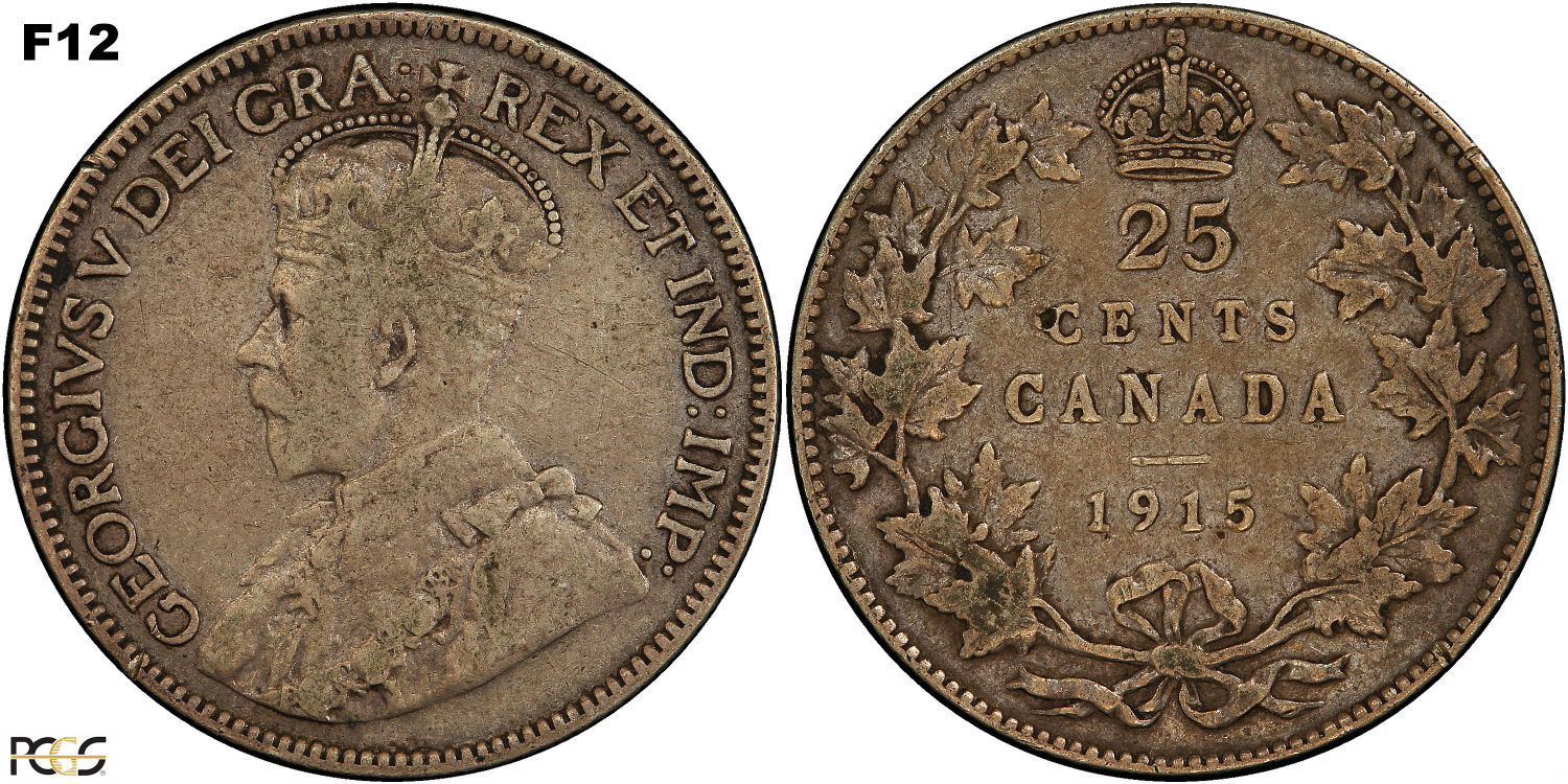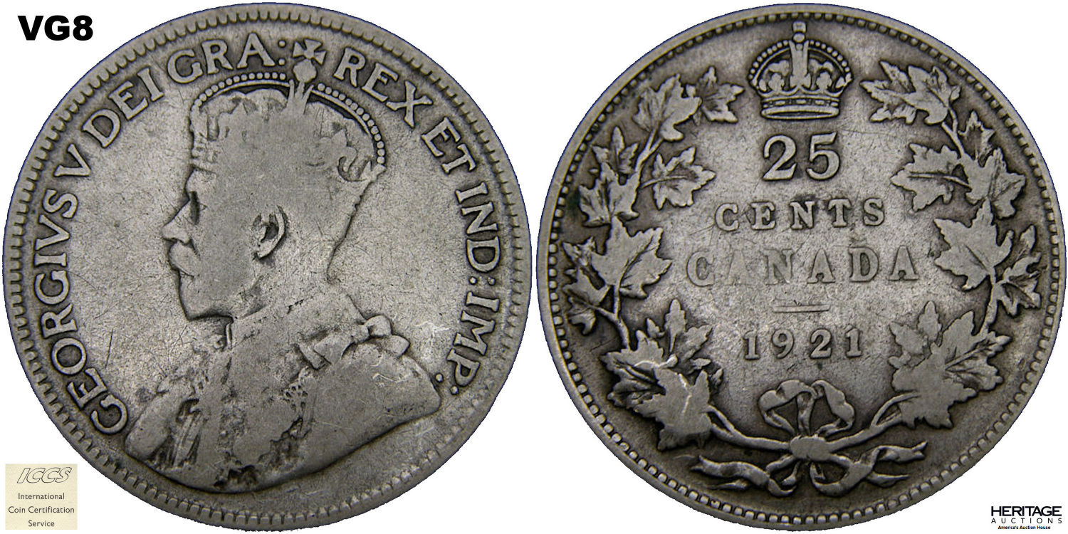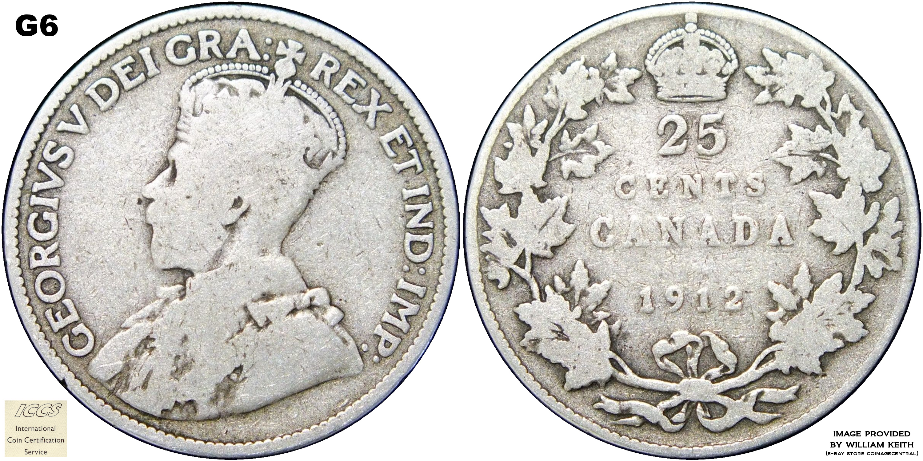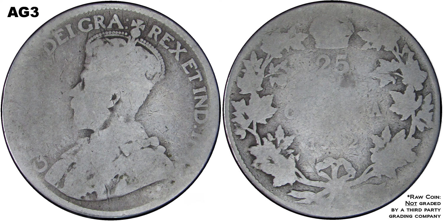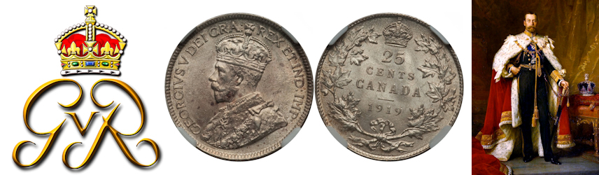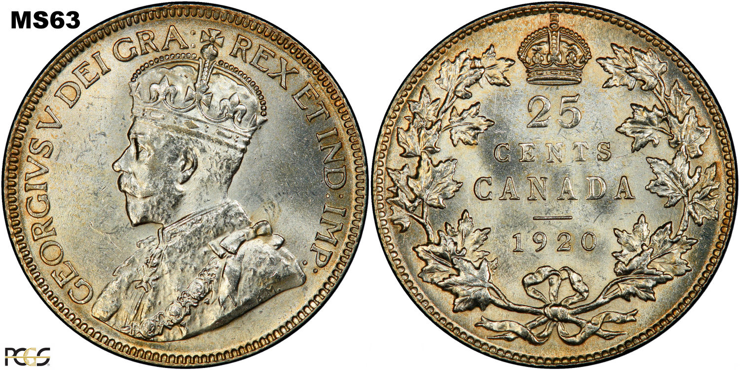 This page describes the criteria used to assign grades to 25 cent Canadian circulation coins issued between 1911 and 1936, which use the portrait of King George V. It also shows sample images of each grade. All photos used here were taken of coins that have been professionally graded by companies like PCGS, NGC, ICCS, CCCS, ANACS, or ICG. NOTE: Click on any photo to load a much larger version of both the obverse and reverse sides of the graded coin. |