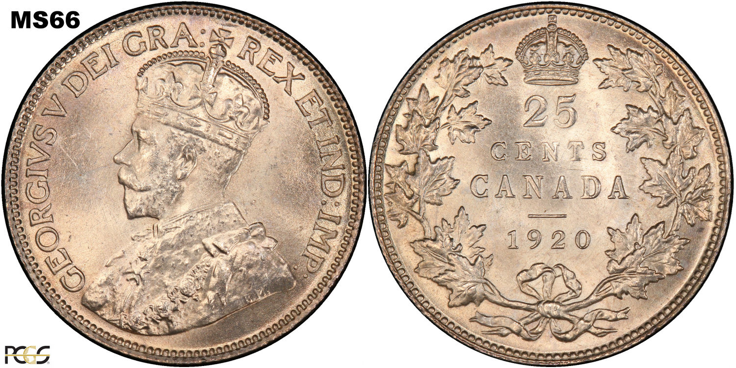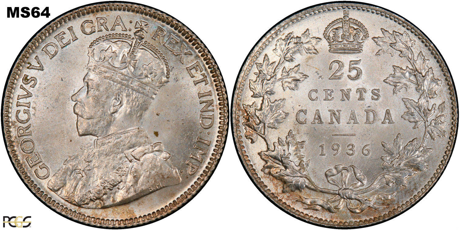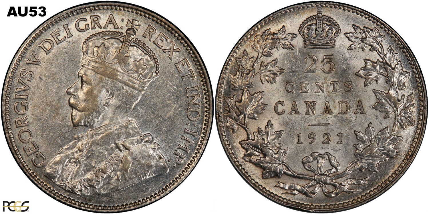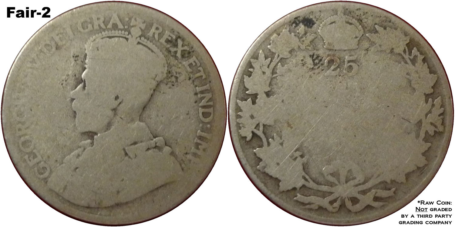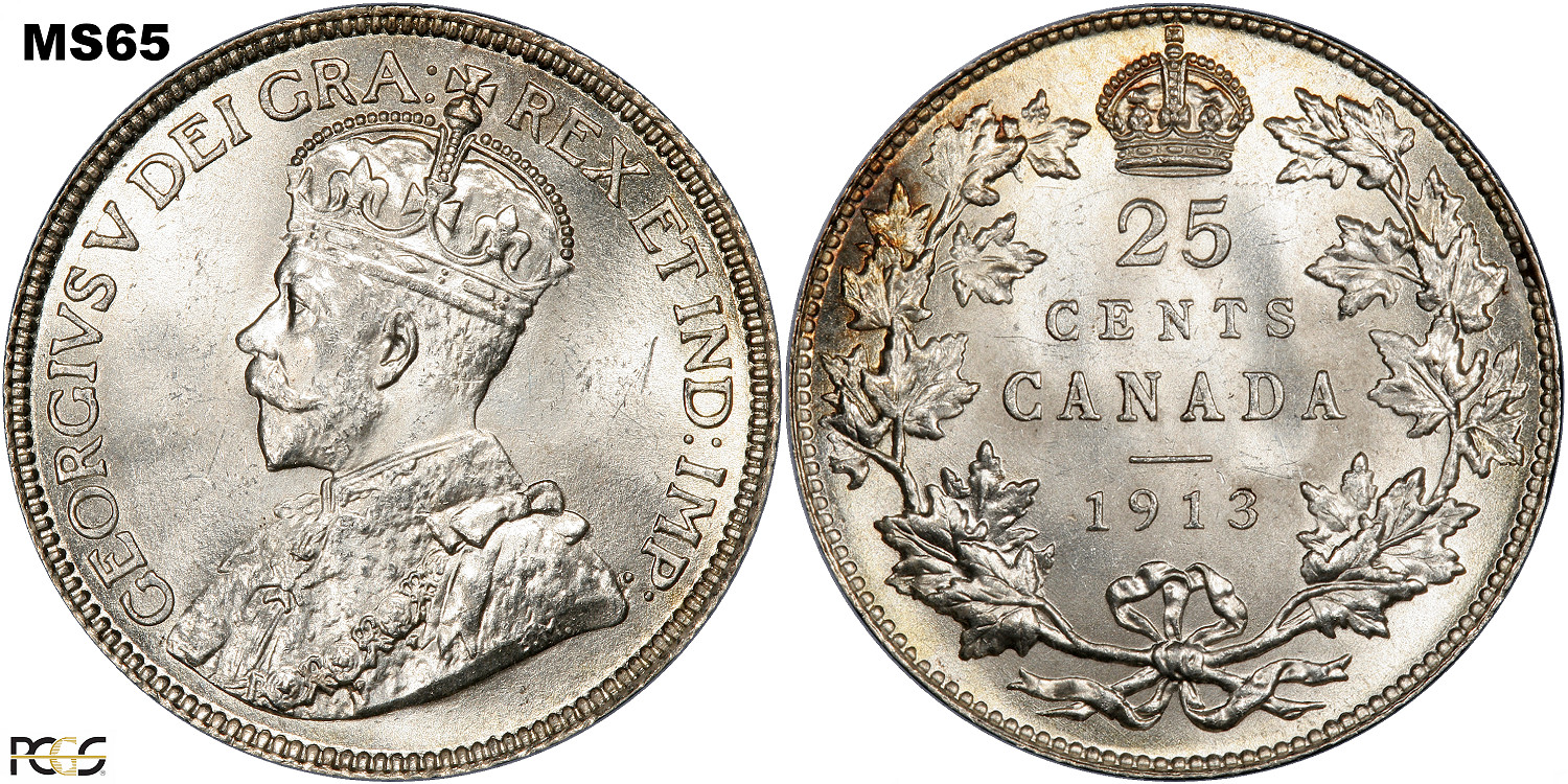 This page describes the criteria used to assign grades to 25 cent Canadian circulation coins issued between 1911 and 1936, which use the portrait of King George V. It also shows sample images of each grade. All photos used here were taken of coins that have been professionally graded by companies like PCGS, NGC, ICCS, CCCS, ANACS, or ICG. NOTE: Click on any photo to load a much larger version of both the obverse and reverse sides of the graded coin. |