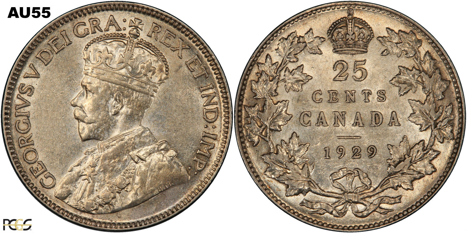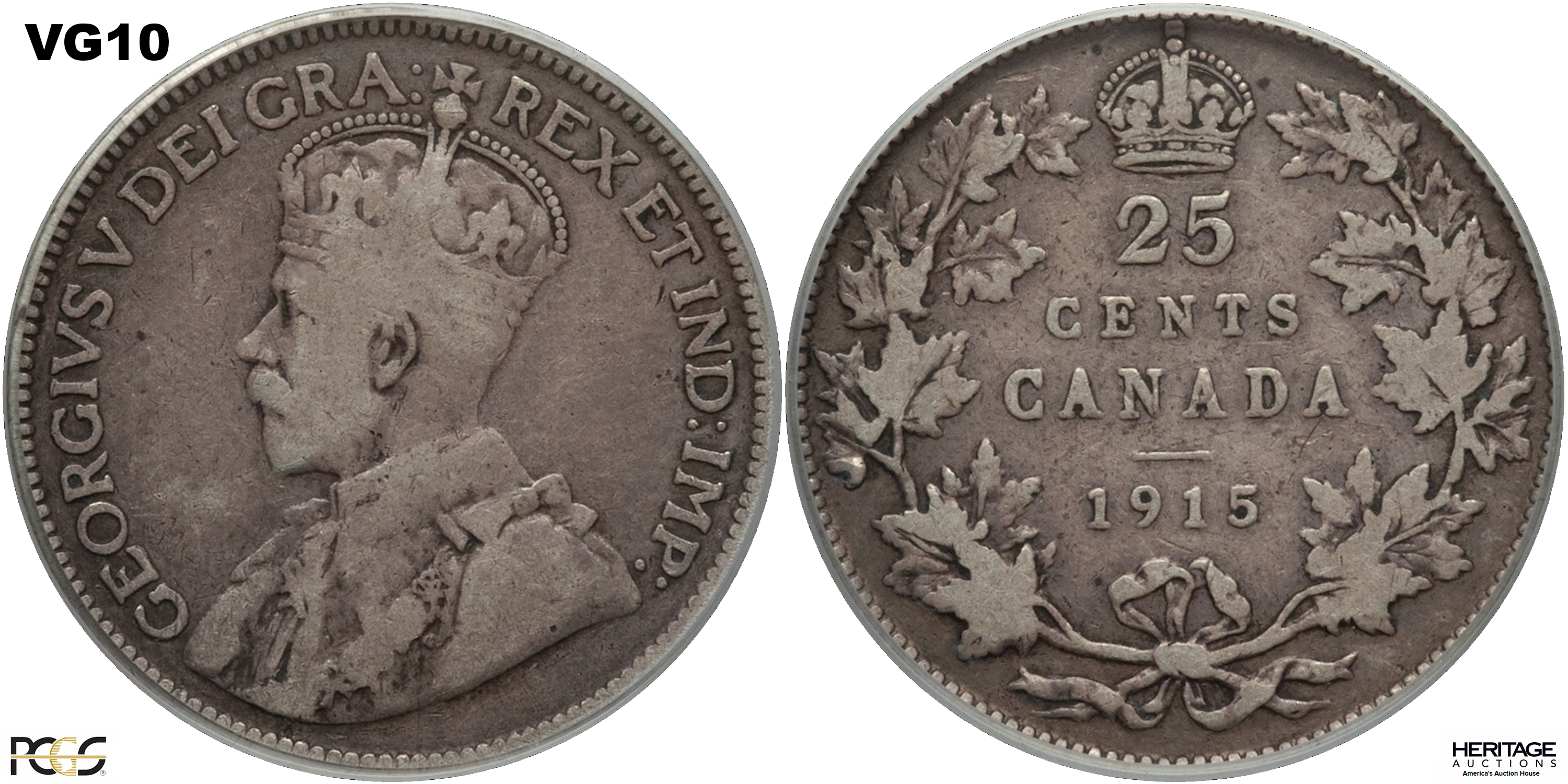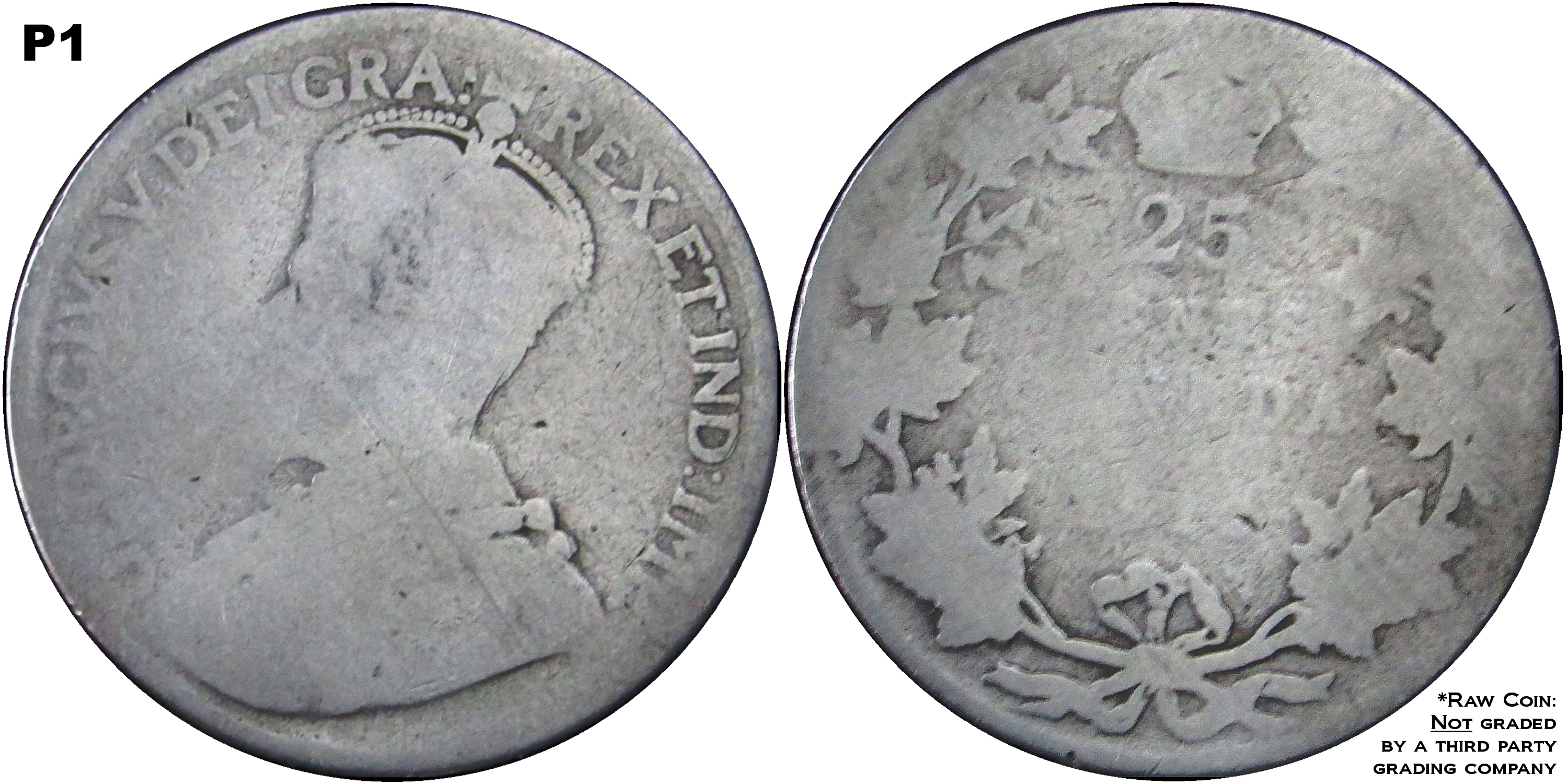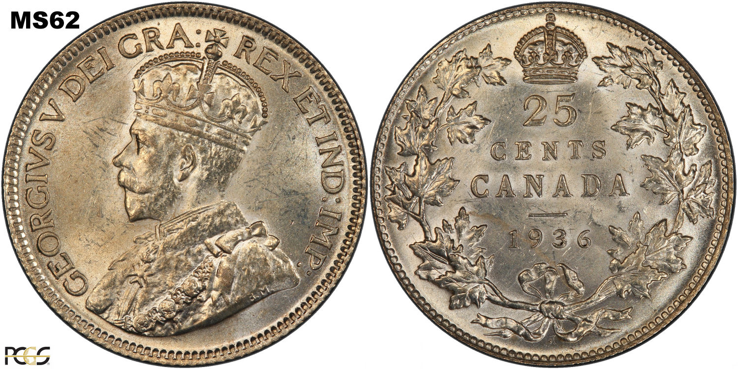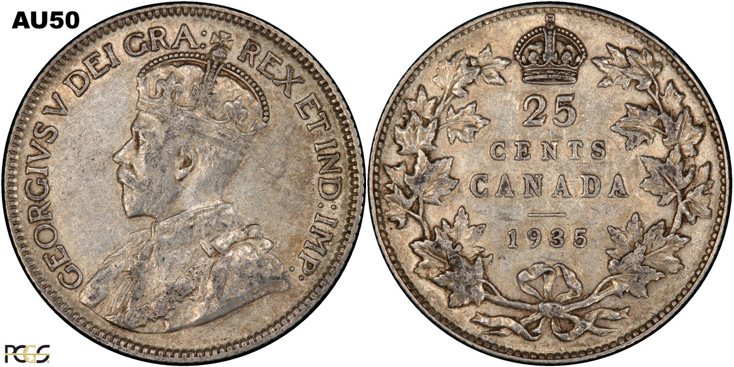 This page describes the criteria used to assign grades to 25 cent Canadian circulation coins issued between 1911 and 1936, which use the portrait of King George V. It also shows sample images of each grade. All photos used here were taken of coins that have been professionally graded by companies like PCGS, NGC, ICCS, CCCS, ANACS, or ICG. NOTE: Click on any photo to load a much larger version of both the obverse and reverse sides of the graded coin. |