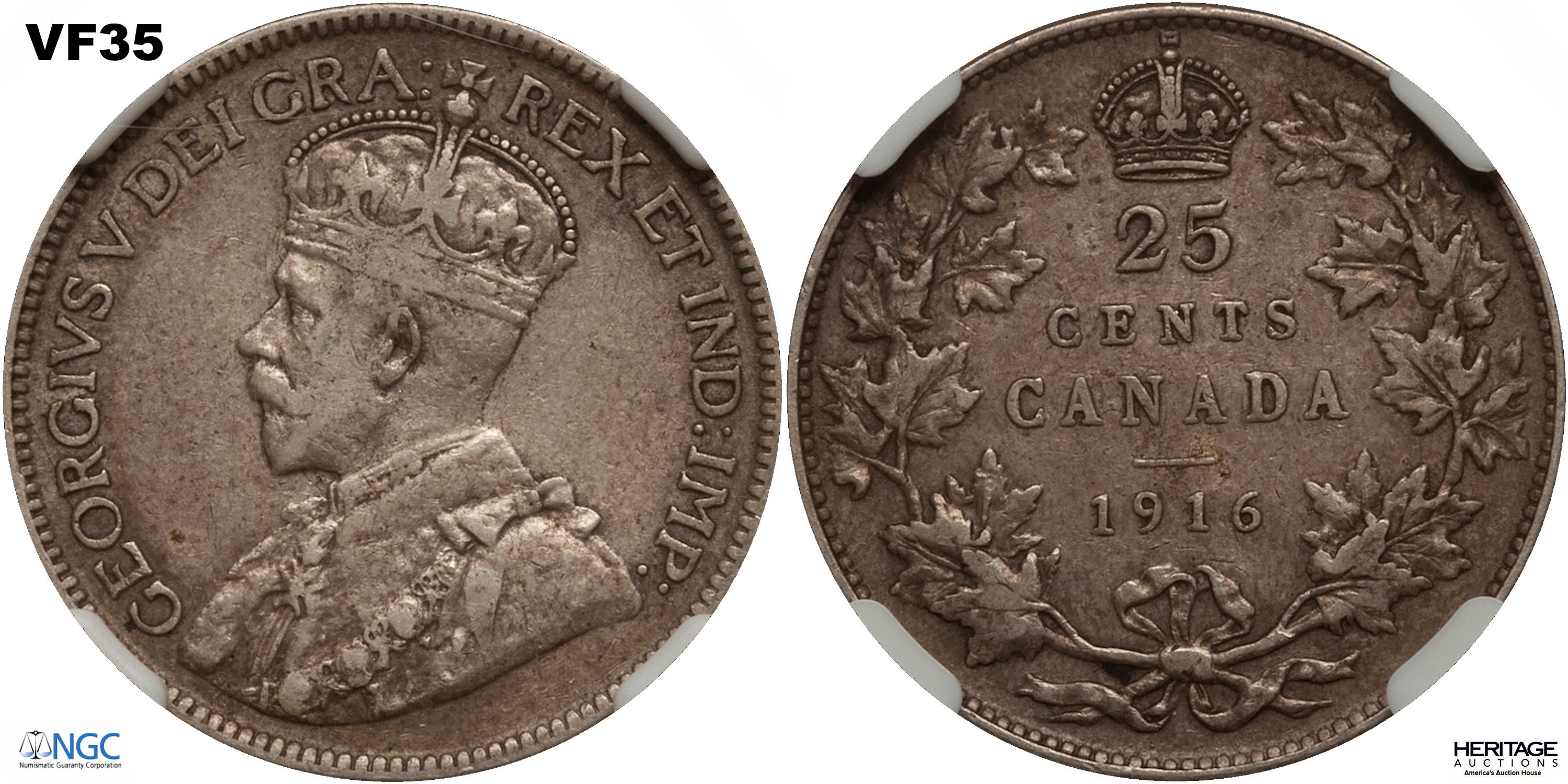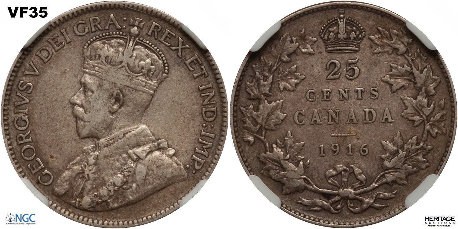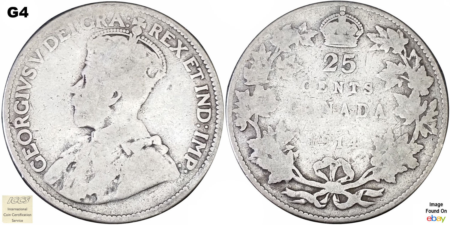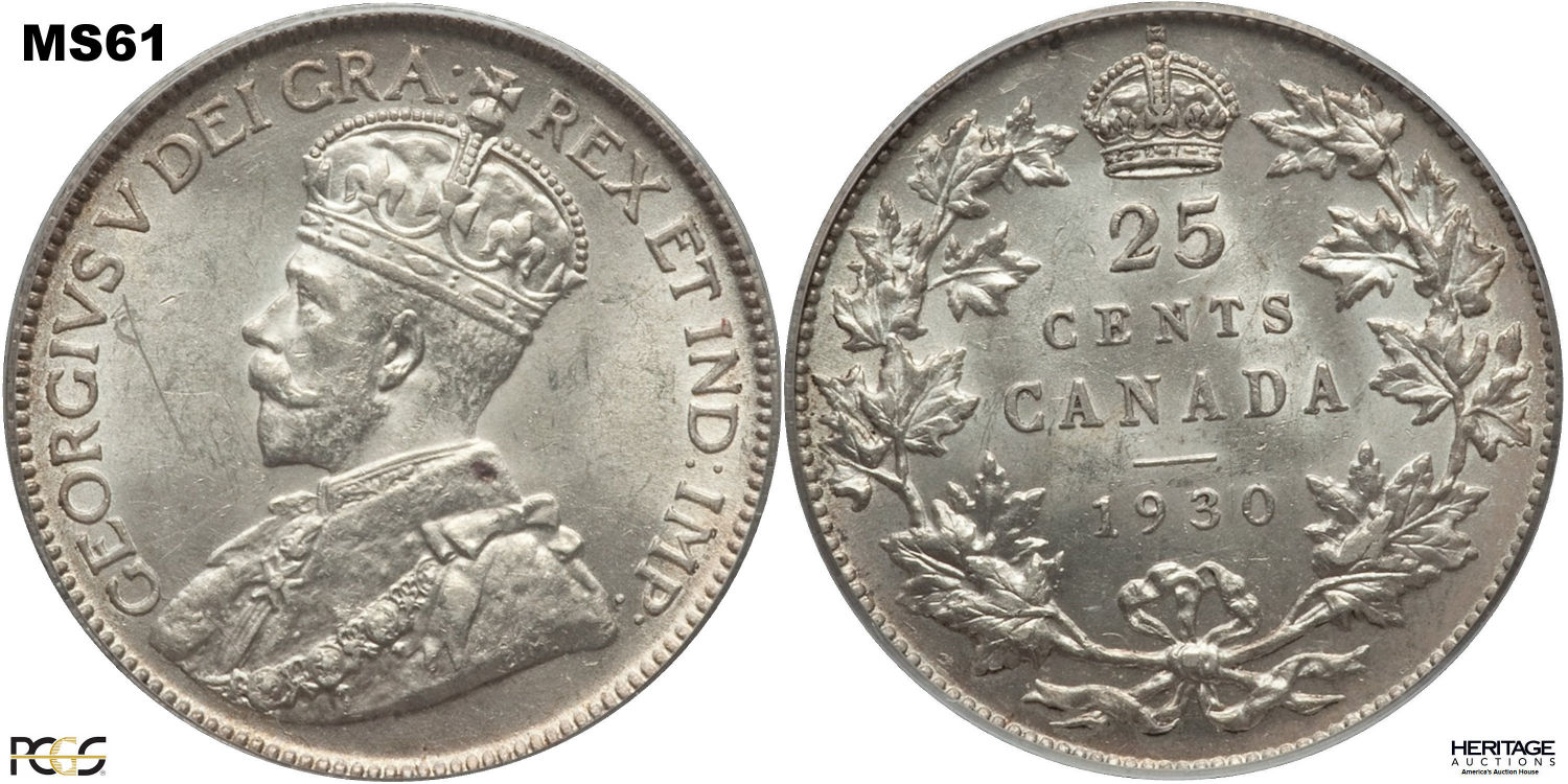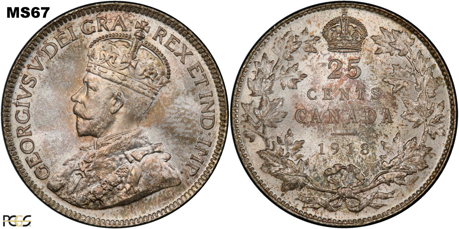 This page describes the criteria used to assign grades to 25 cent Canadian circulation coins issued between 1911 and 1936, which use the portrait of King George V. It also shows sample images of each grade. All photos used here were taken of coins that have been professionally graded by companies like PCGS, NGC, ICCS, CCCS, ANACS, or ICG. NOTE: Click on any photo to load a much larger version of both the obverse and reverse sides of the graded coin. |