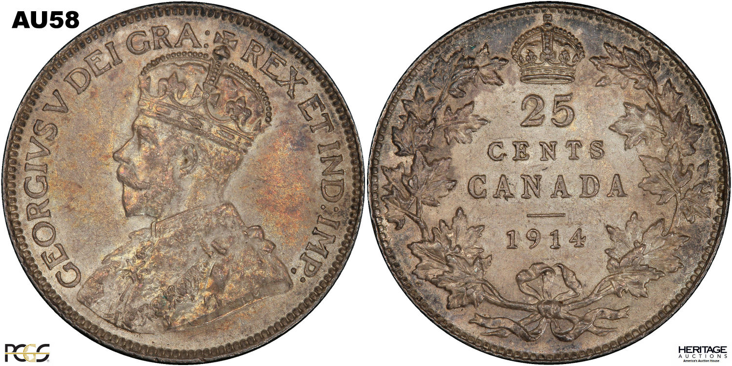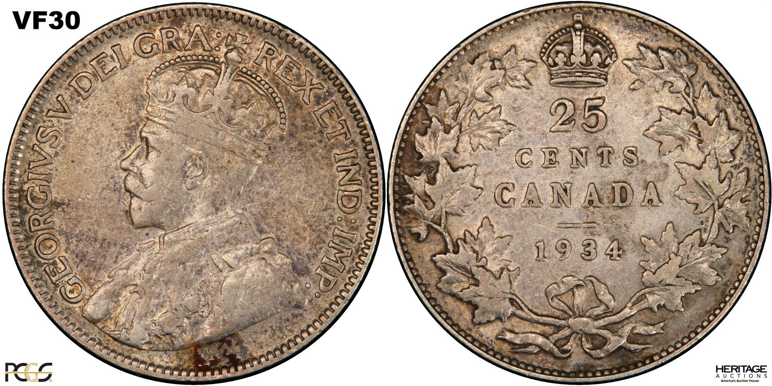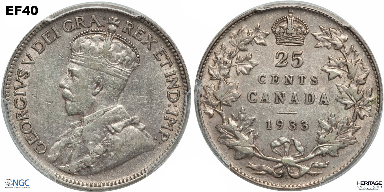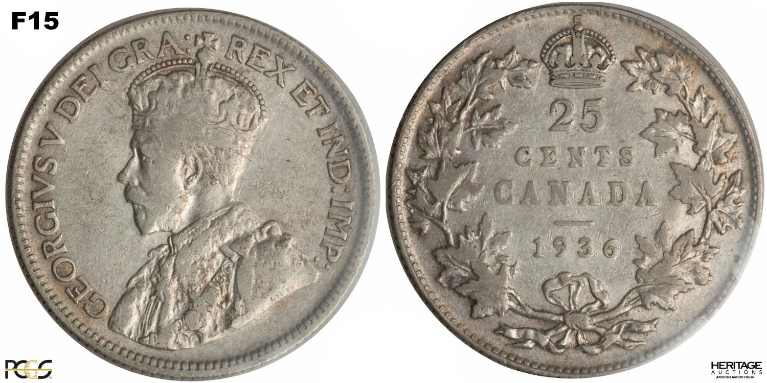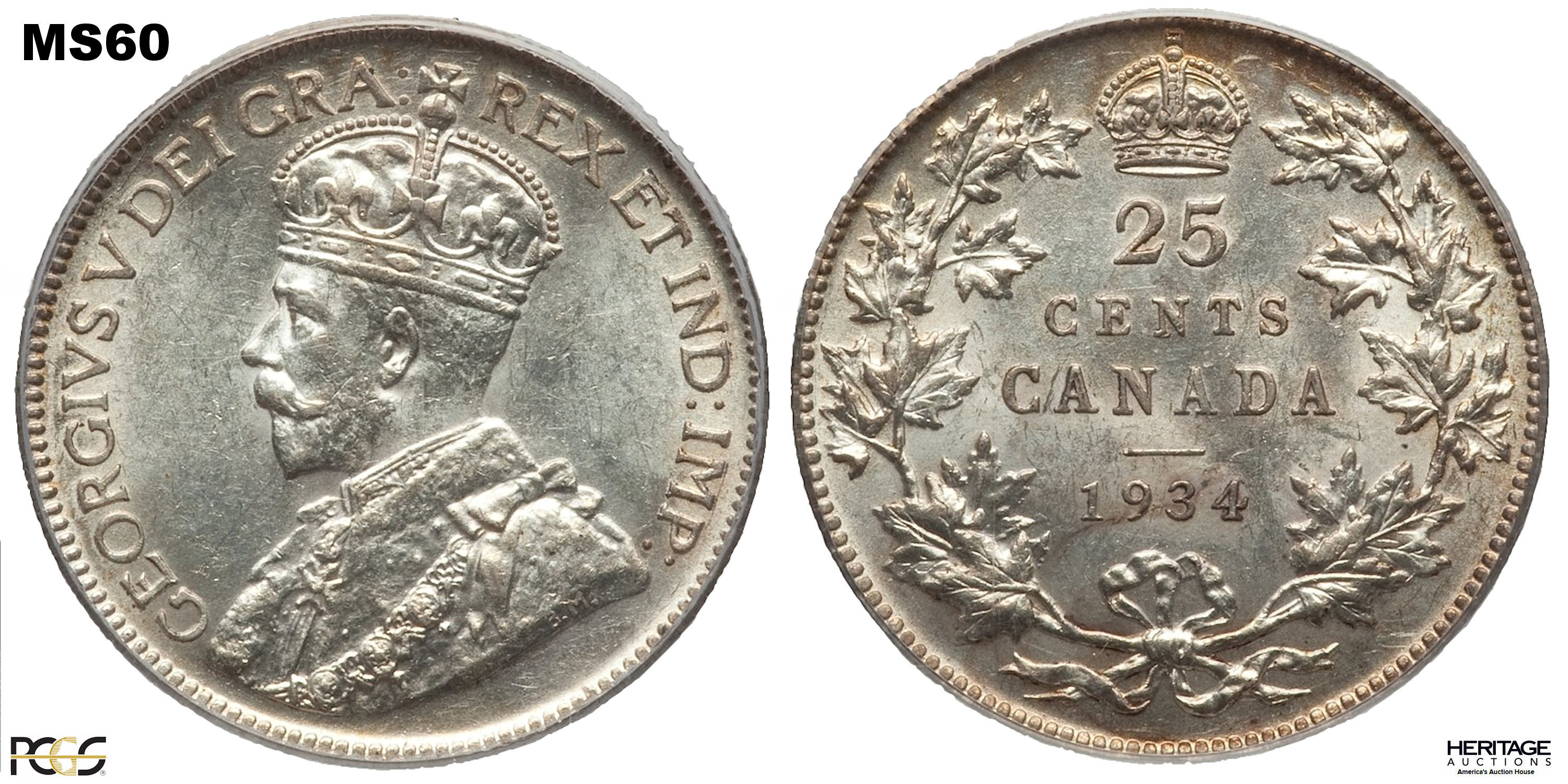 This page describes the criteria used to assign grades to 25 cent Canadian circulation coins issued between 1911 and 1936, which use the portrait of King George V. It also shows sample images of each grade. All photos used here were taken of coins that have been professionally graded by companies like PCGS, NGC, ICCS, CCCS, ANACS, or ICG. NOTE: Click on any photo to load a much larger version of both the obverse and reverse sides of the graded coin. |