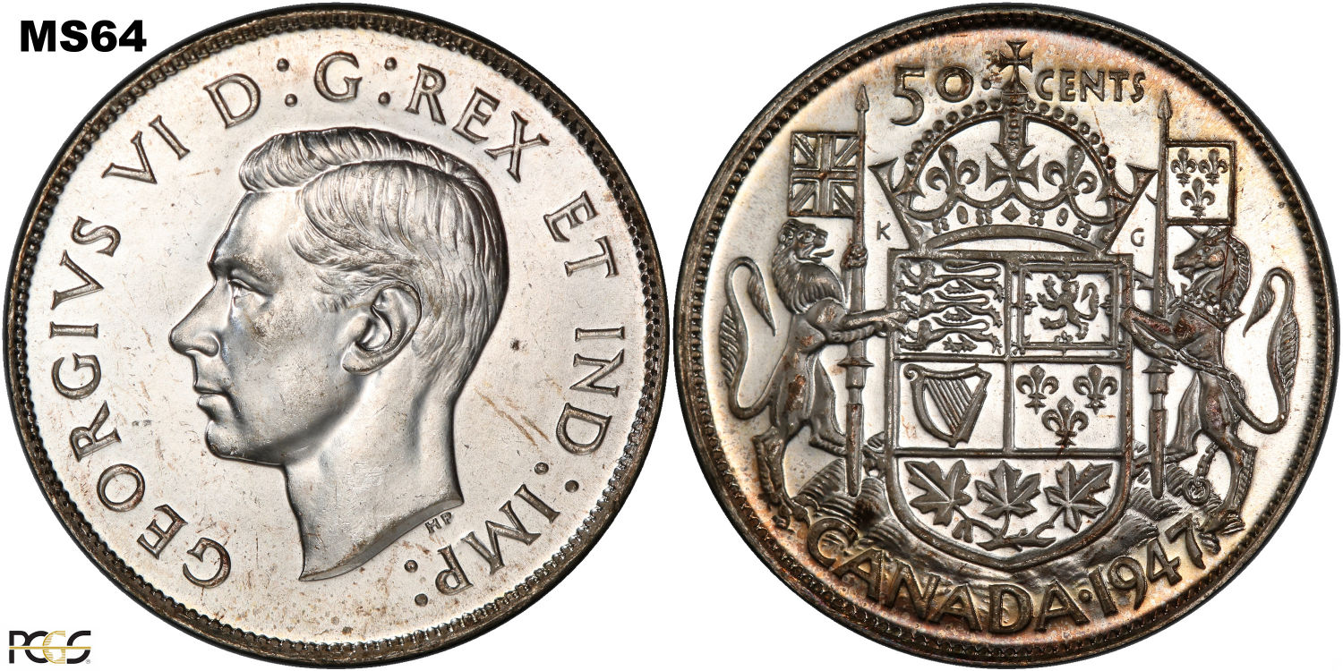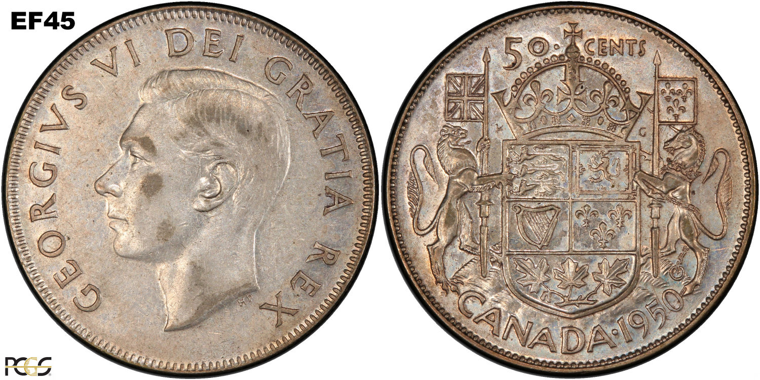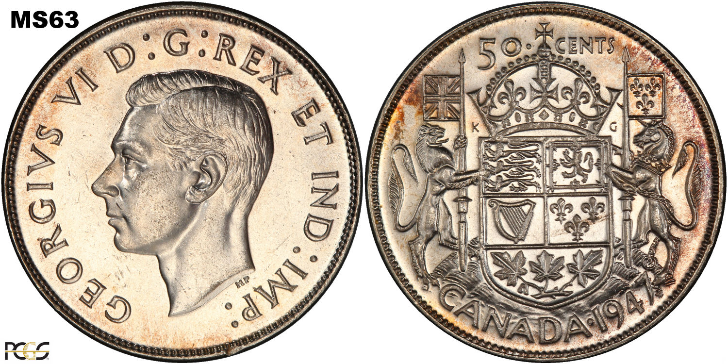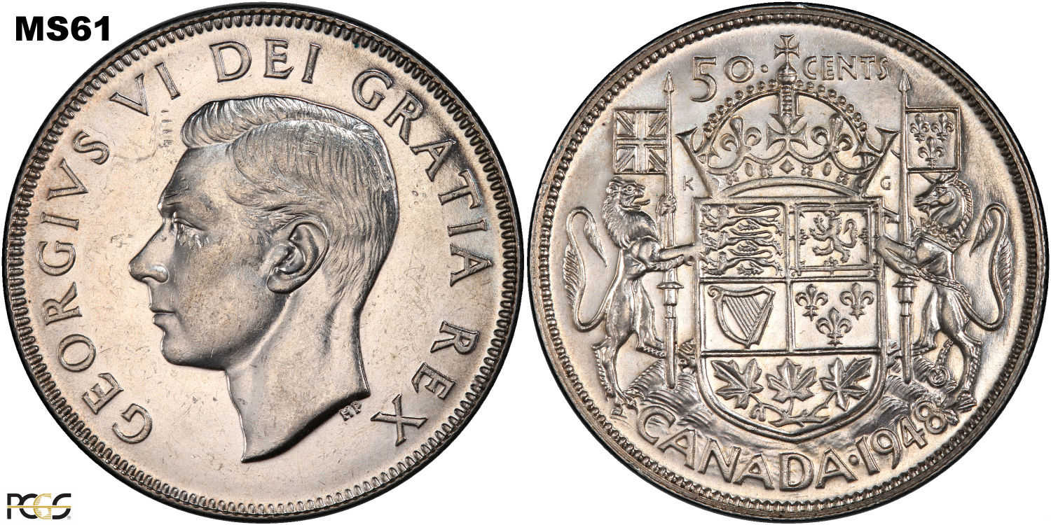 This page describes the criteria used to assign grades to 50 cent Canadian circulation coins which use the portrait of King George VI, issued between 1937 and 1952. It also shows sample images of each grade. All photos used here were taken of coins that have been professionally graded by companies like PCGS, NGC, ICCS, CCCS, ANACS, or ICG. NOTE: Click on any photo to load a much larger version of both the obverse and reverse sides of the graded coin. Once that photo has loaded on screen, if you click it again you will see a huge photo which allows you to see every fine detail. |