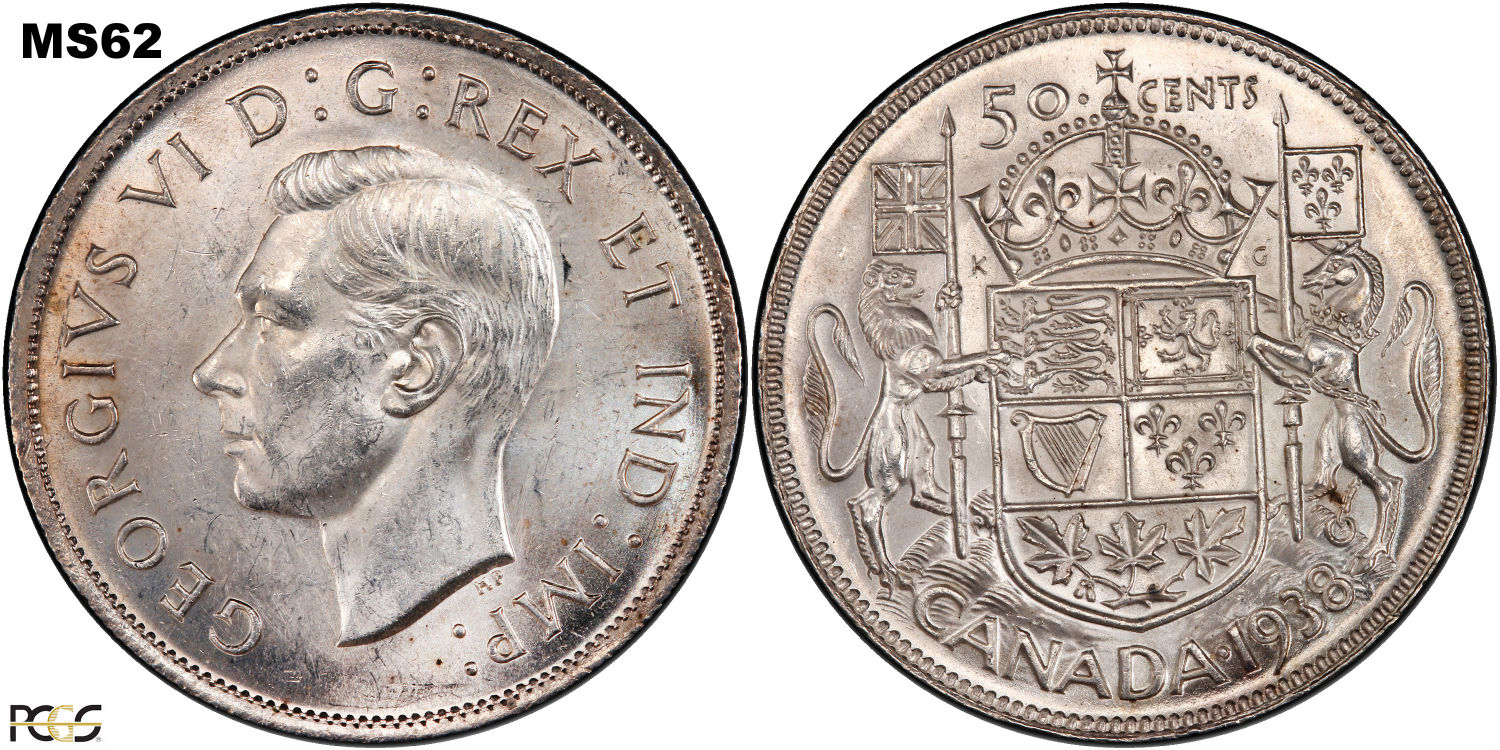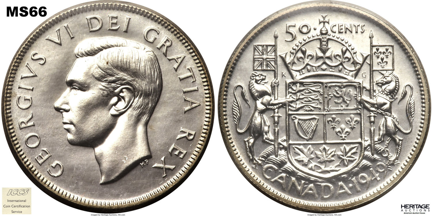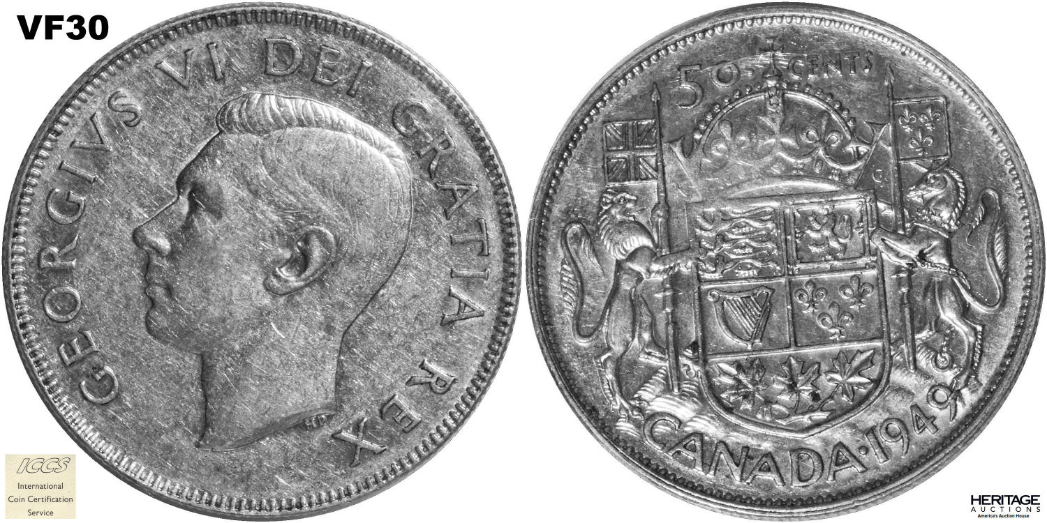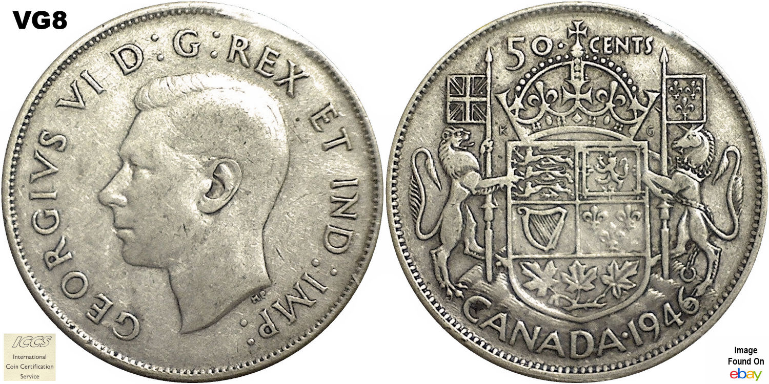 This page describes the criteria used to assign grades to 50 cent Canadian circulation coins which use the portrait of King George VI, issued between 1937 and 1952. It also shows sample images of each grade. All photos used here were taken of coins that have been professionally graded by companies like PCGS, NGC, ICCS, CCCS, ANACS, or ICG. NOTE: Click on any photo to load a much larger version of both the obverse and reverse sides of the graded coin. Once that photo has loaded on screen, if you click it again you will see a huge photo which allows you to see every fine detail. |