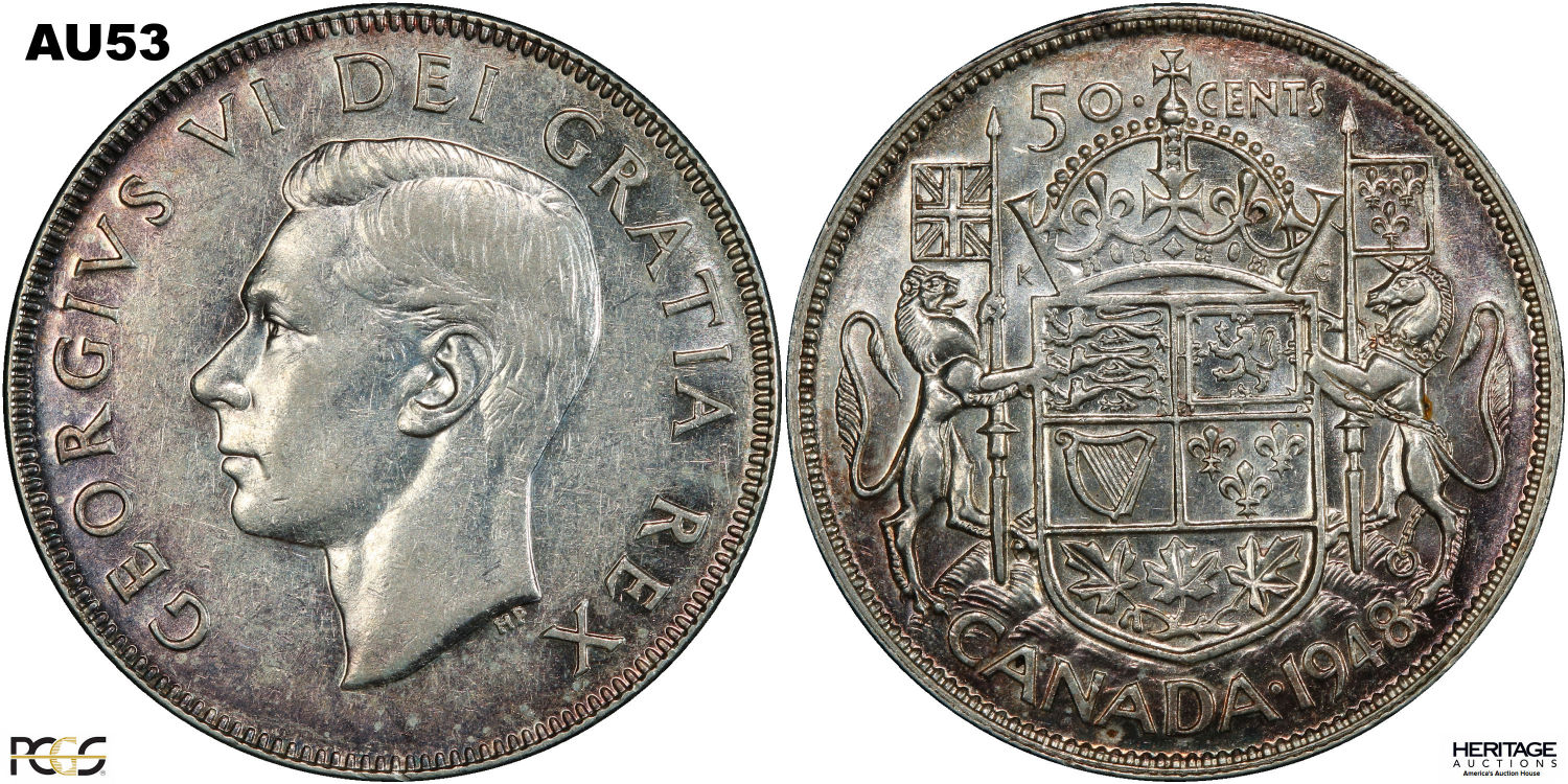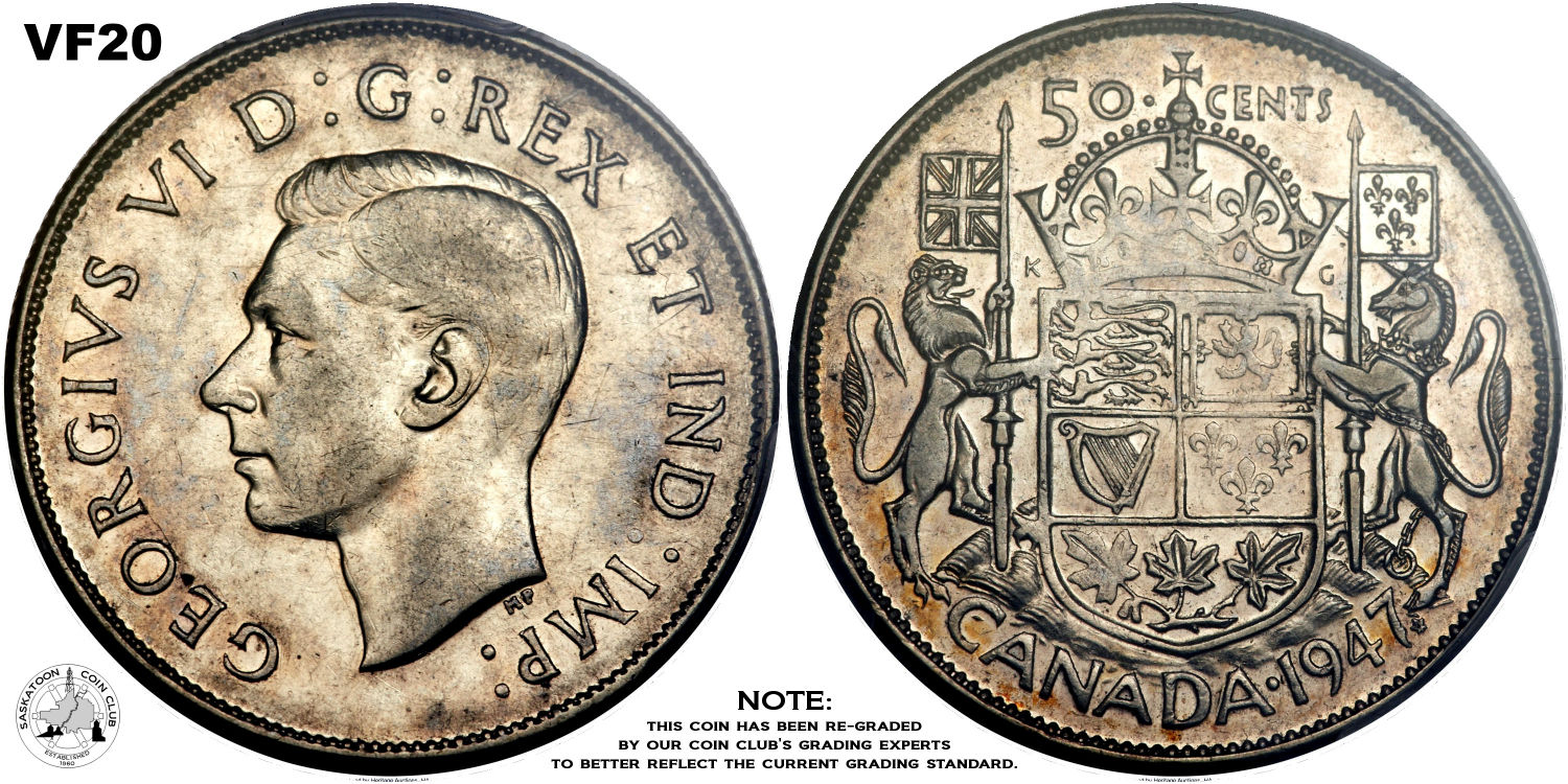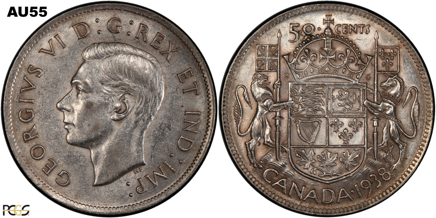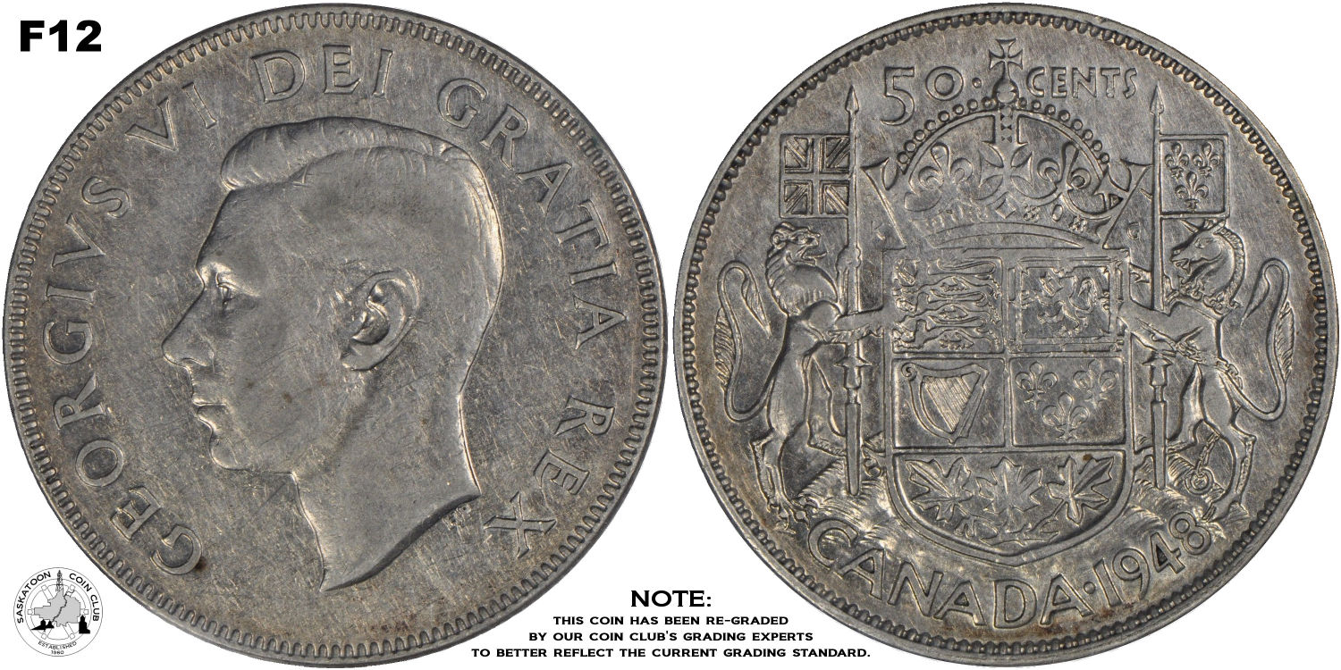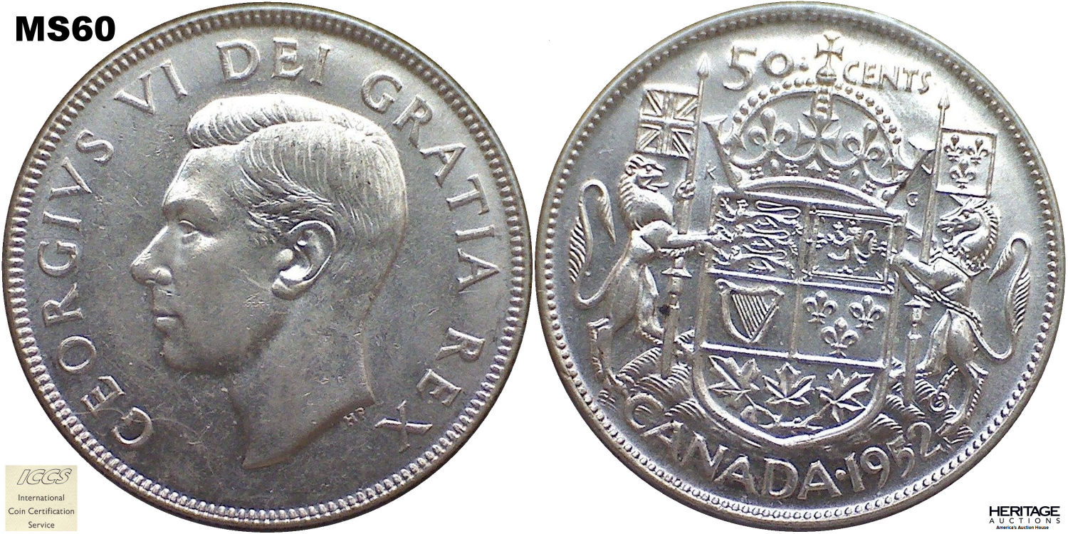 This page describes the criteria used to assign grades to 50 cent Canadian circulation coins which use the portrait of King George VI, issued between 1937 and 1952. It also shows sample images of each grade. All photos used here were taken of coins that have been professionally graded by companies like PCGS, NGC, ICCS, CCCS, ANACS, or ICG. NOTE: Click on any photo to load a much larger version of both the obverse and reverse sides of the graded coin. Once that photo has loaded on screen, if you click it again you will see a huge photo which allows you to see every fine detail. |