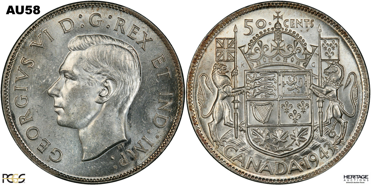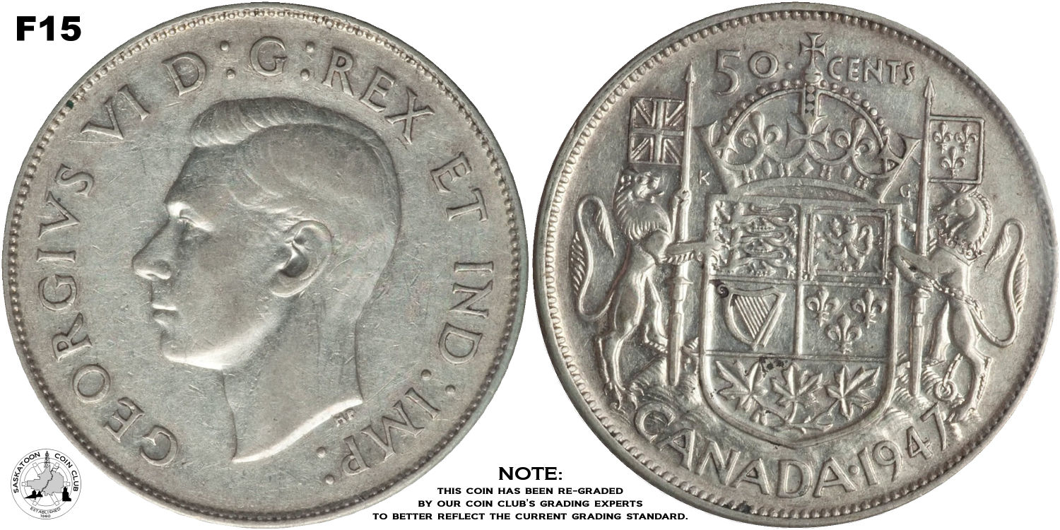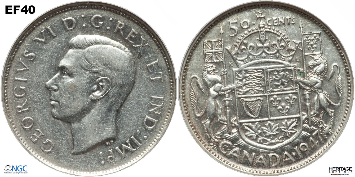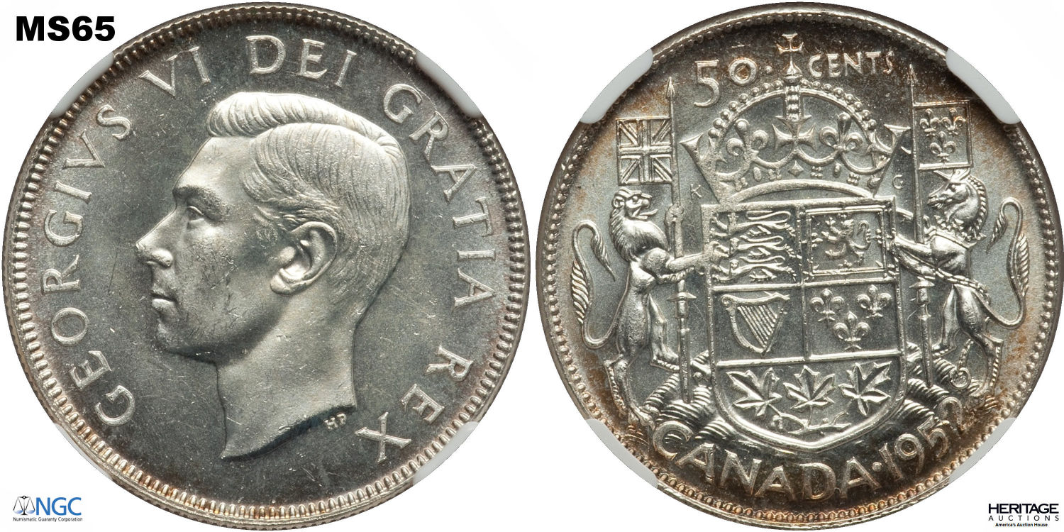 This page describes the criteria used to assign grades to 50 cent Canadian circulation coins which use the portrait of King George VI, issued between 1937 and 1952. It also shows sample images of each grade. All photos used here were taken of coins that have been professionally graded by companies like PCGS, NGC, ICCS, CCCS, ANACS, or ICG. NOTE: Click on any photo to load a much larger version of both the obverse and reverse sides of the graded coin. Once that photo has loaded on screen, if you click it again you will see a huge photo which allows you to see every fine detail. |