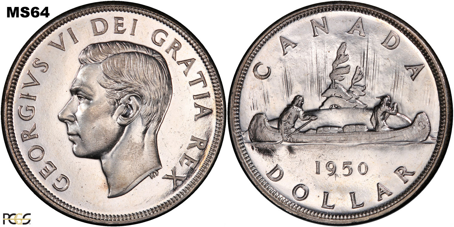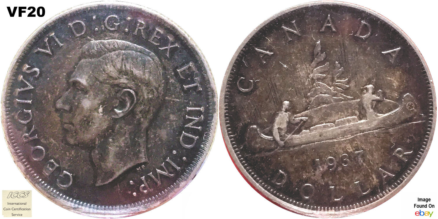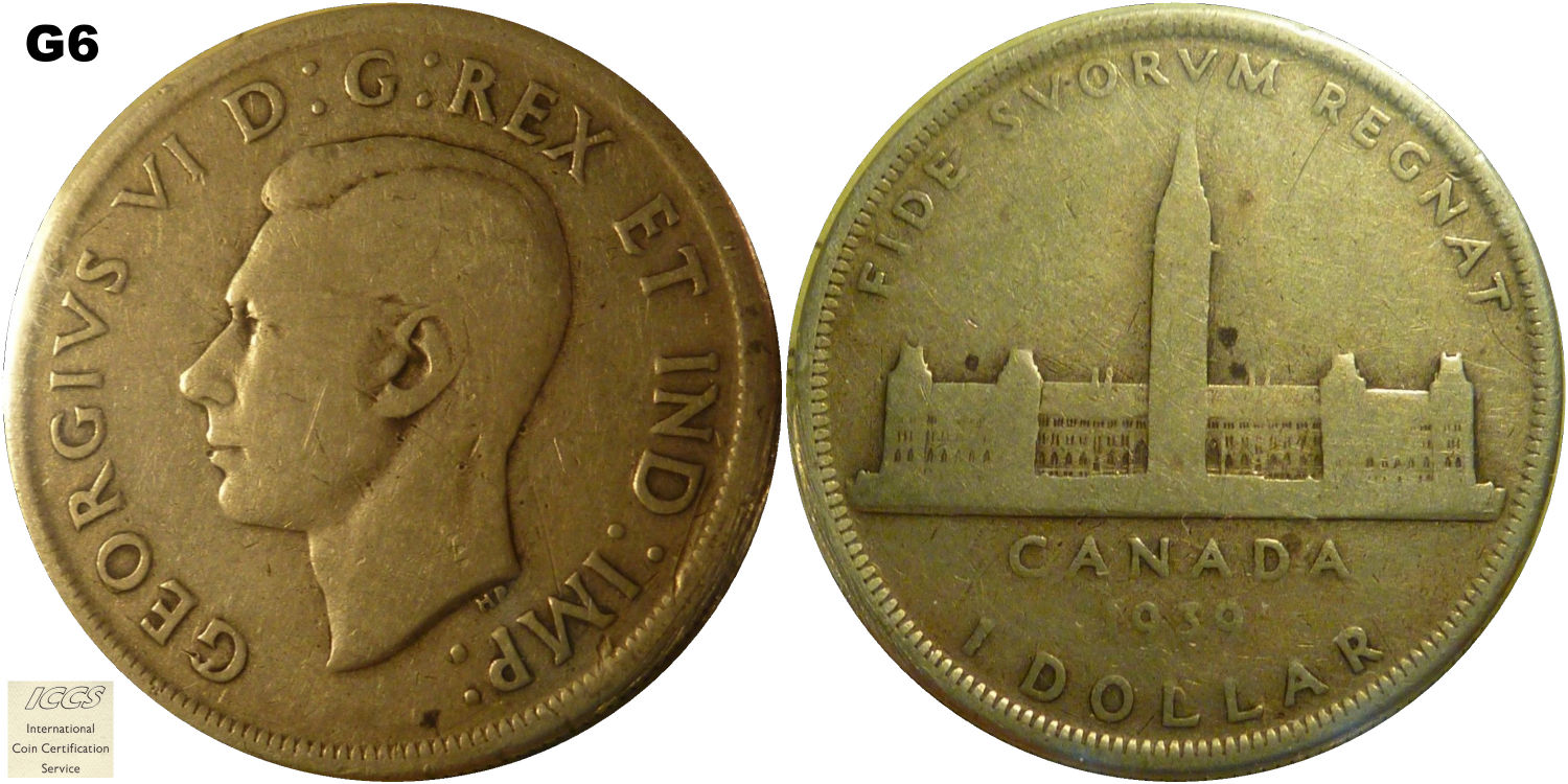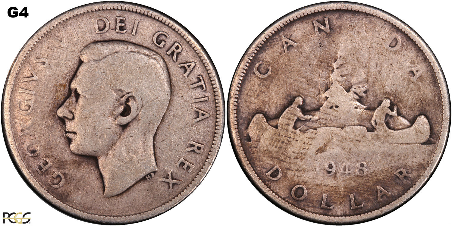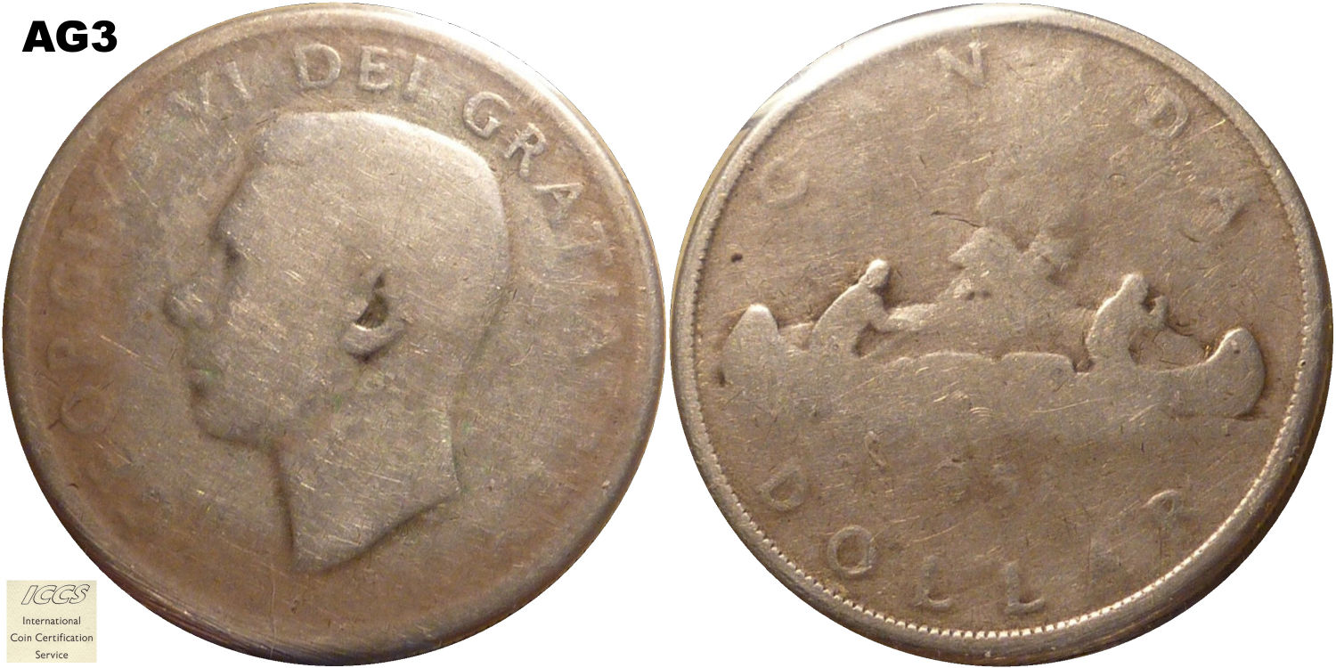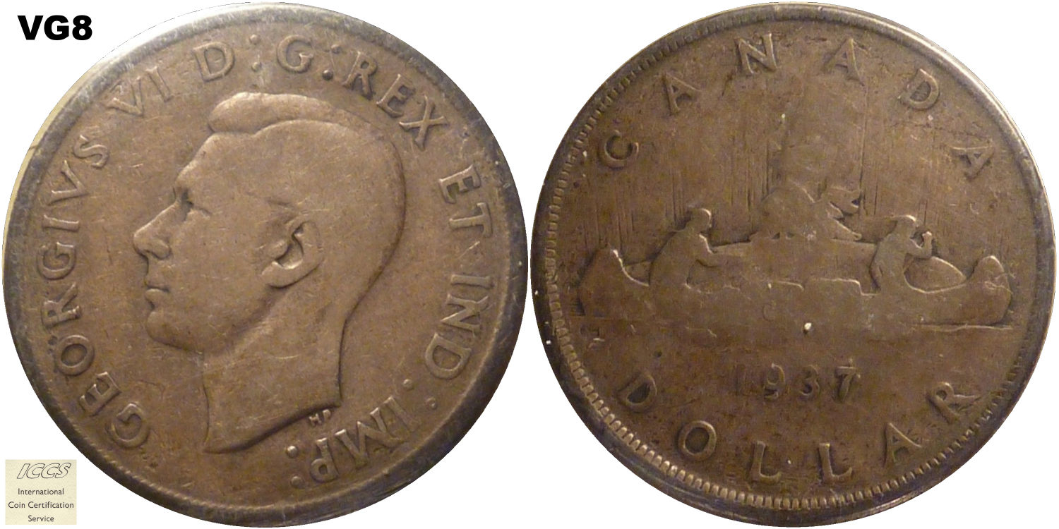 This page describes the criteria used to assign grades to 1 dollar Canadian circulation coins which use the portrait of King George VI, issued between 1937 and 1952. It also shows sample images of each grade. All photos used here were taken of coins that have been professionally graded by companies like PCGS, NGC, ICCS, CCCS, ANACS, or ICG. NOTE: Click on any photo to load a much larger version of both the obverse and reverse sides of the graded coin. Once that photo has loaded on screen, if you click it again you will see a huge photo which allows you to see every fine detail. |