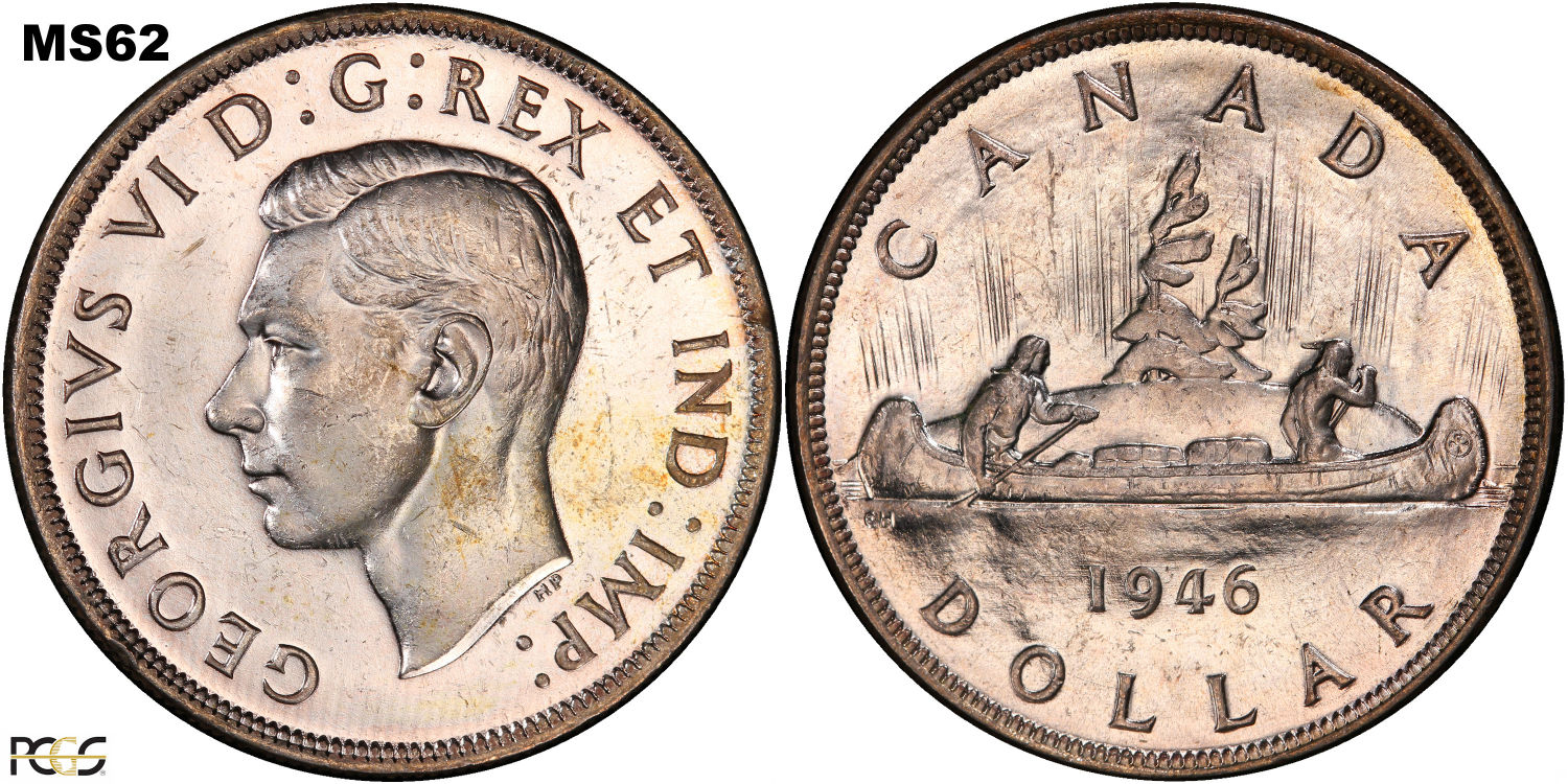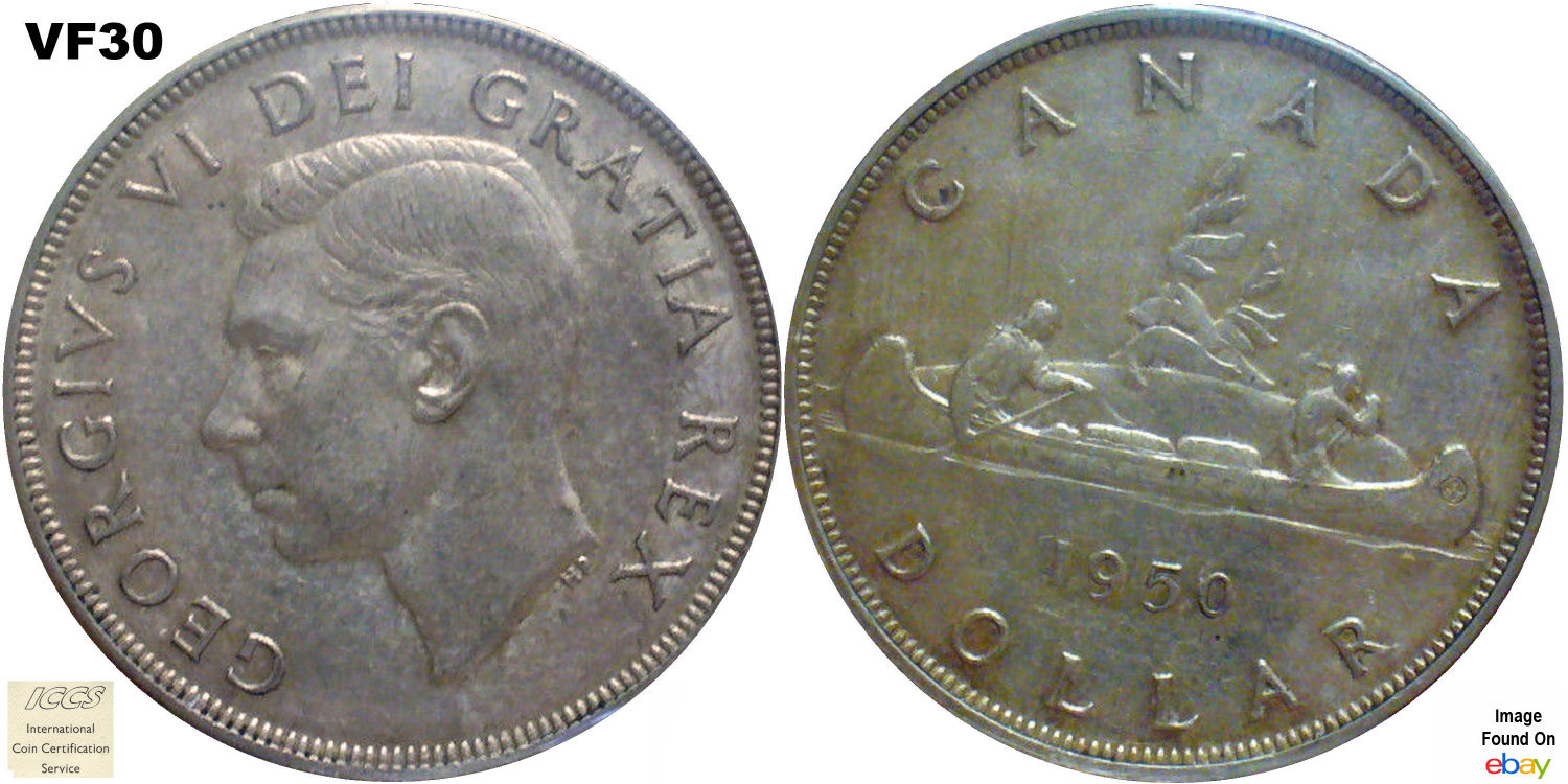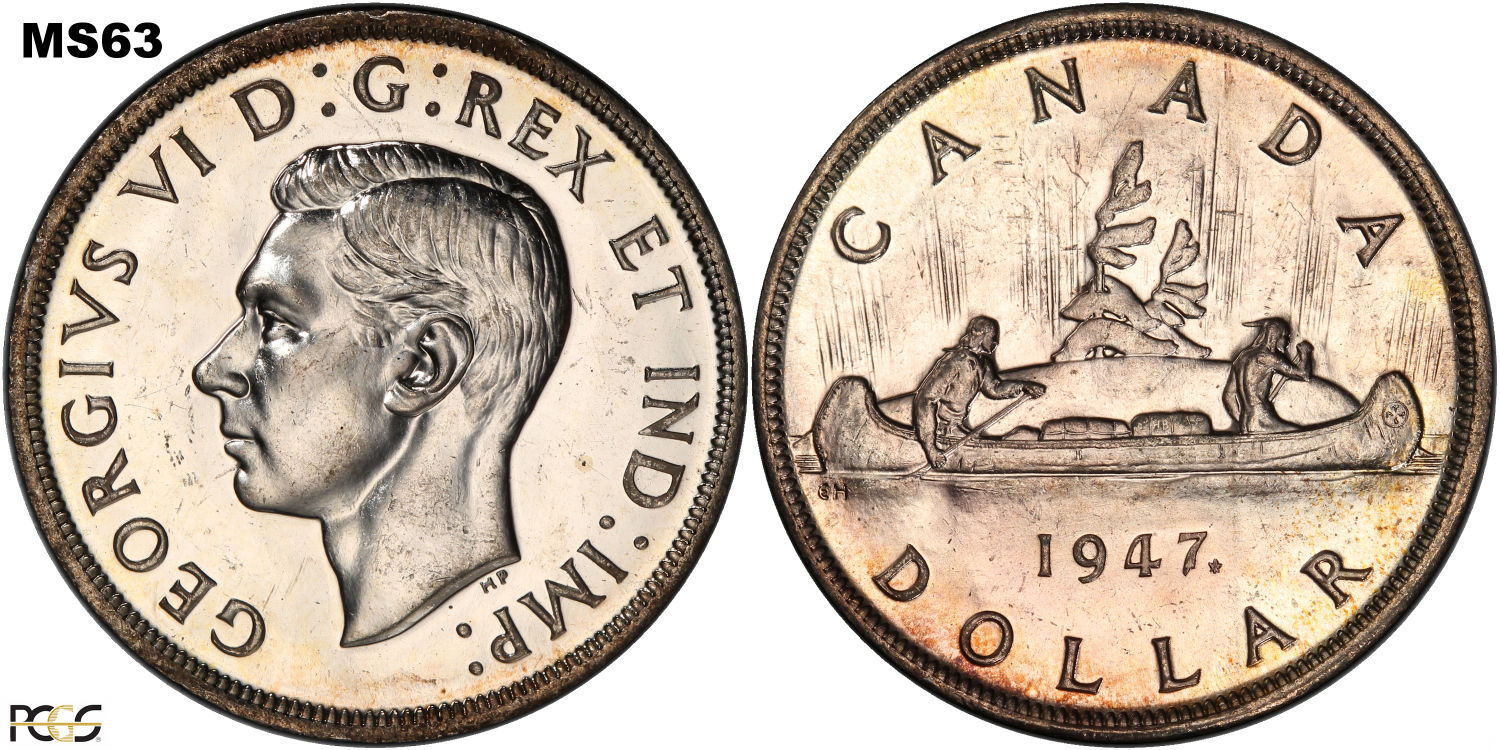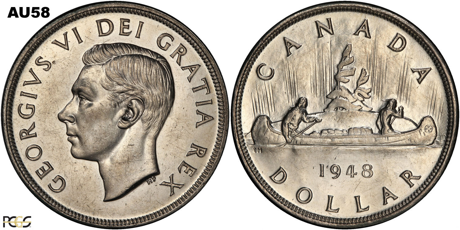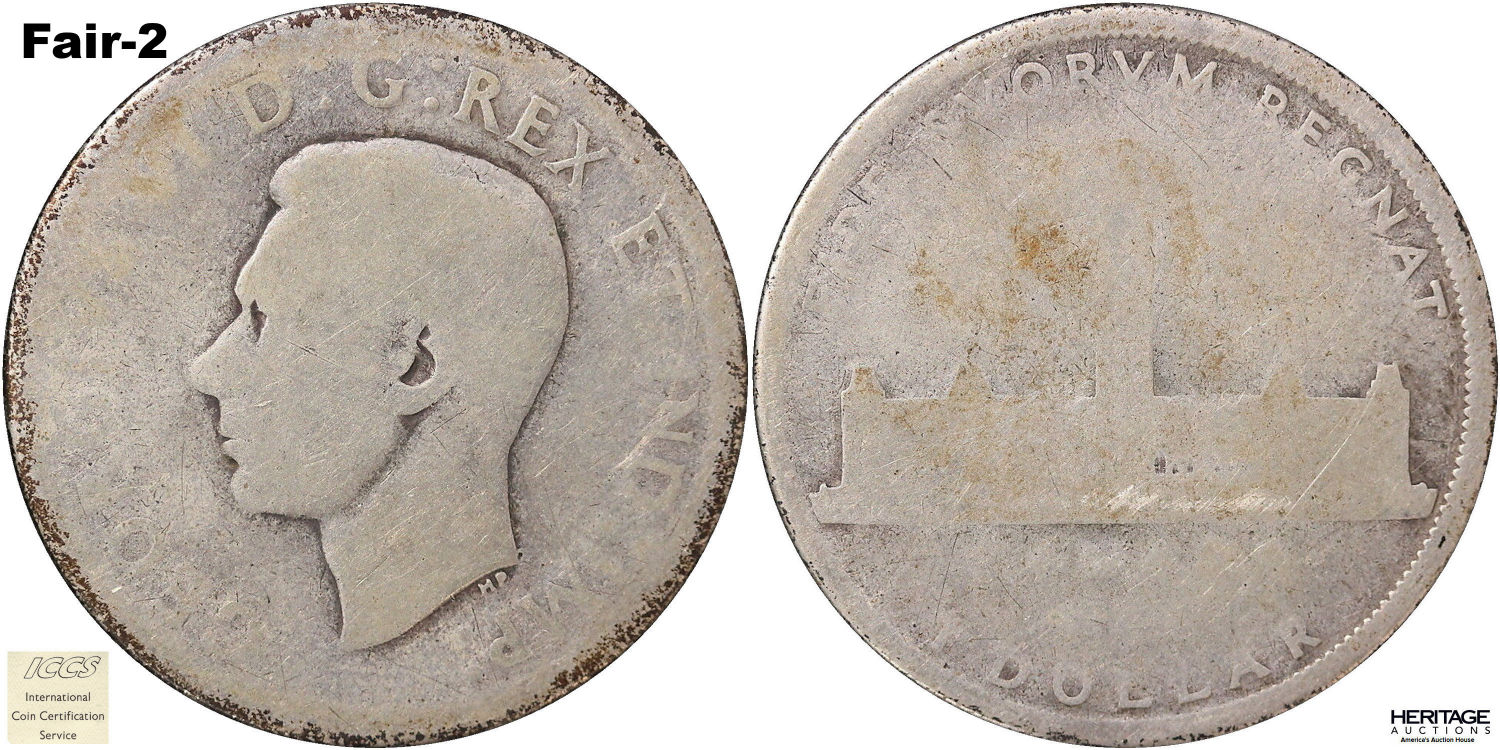 This page describes the criteria used to assign grades to 1 dollar Canadian circulation coins which use the portrait of King George VI, issued between 1937 and 1952. It also shows sample images of each grade. All photos used here were taken of coins that have been professionally graded by companies like PCGS, NGC, ICCS, CCCS, ANACS, or ICG. NOTE: Click on any photo to load a much larger version of both the obverse and reverse sides of the graded coin. Once that photo has loaded on screen, if you click it again you will see a huge photo which allows you to see every fine detail. |