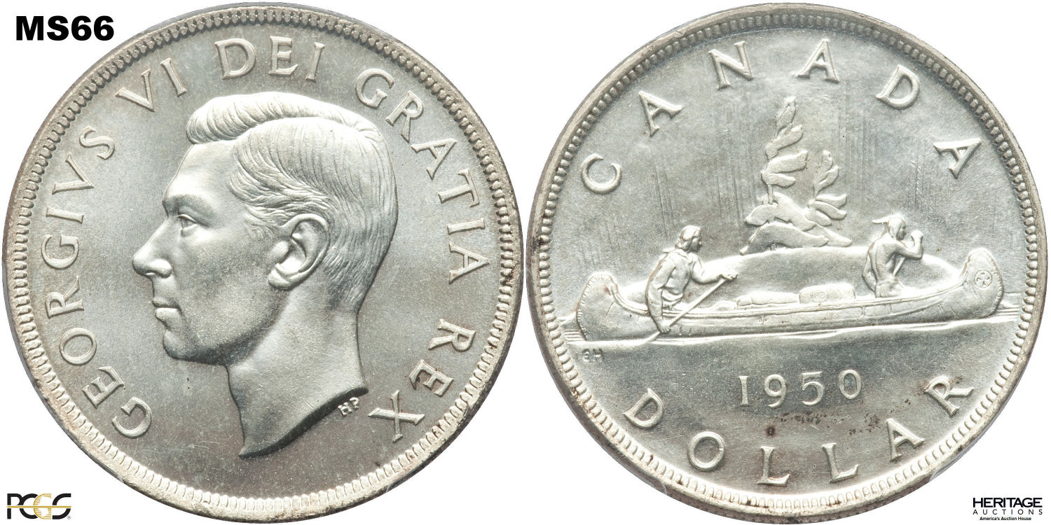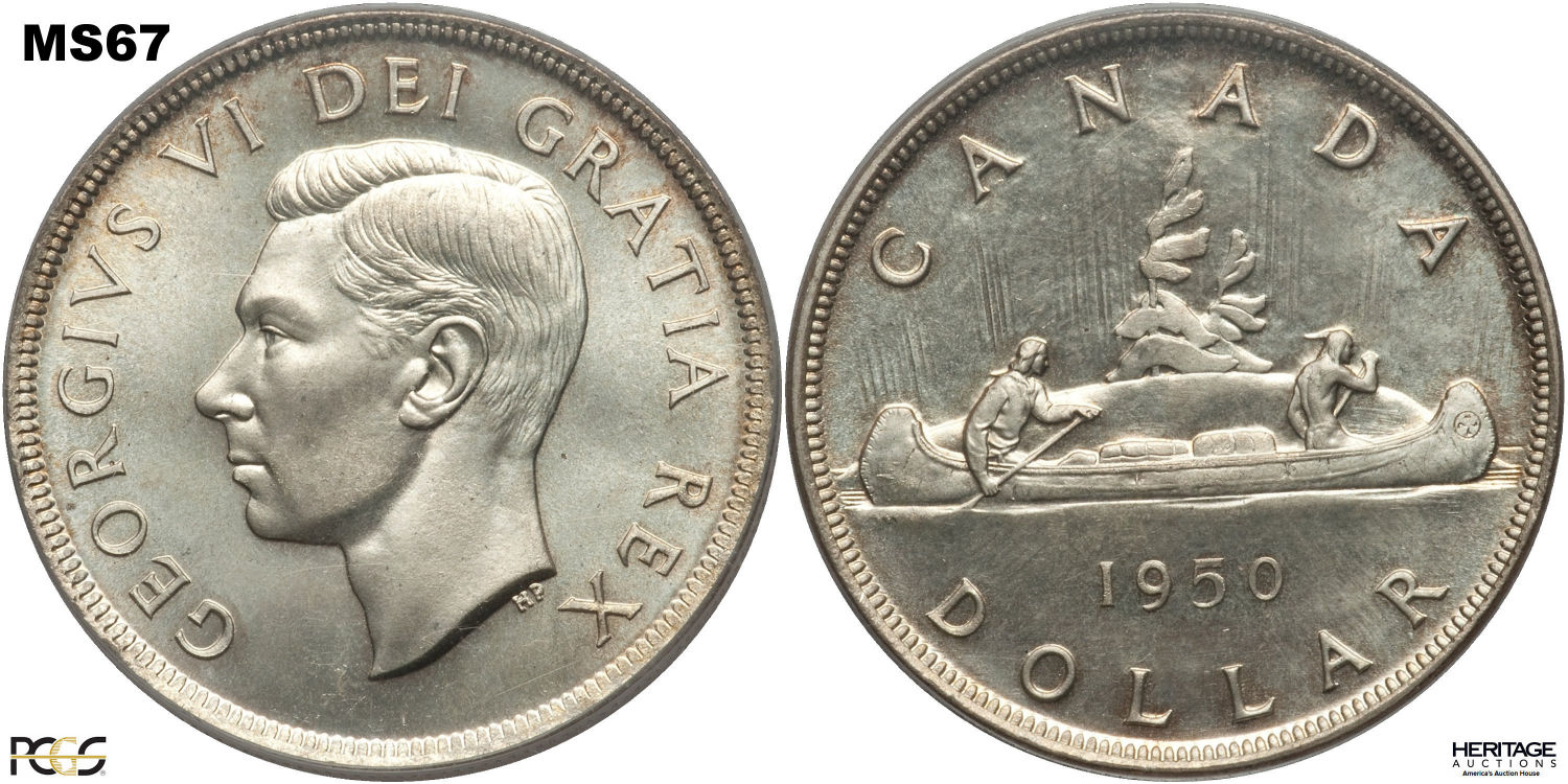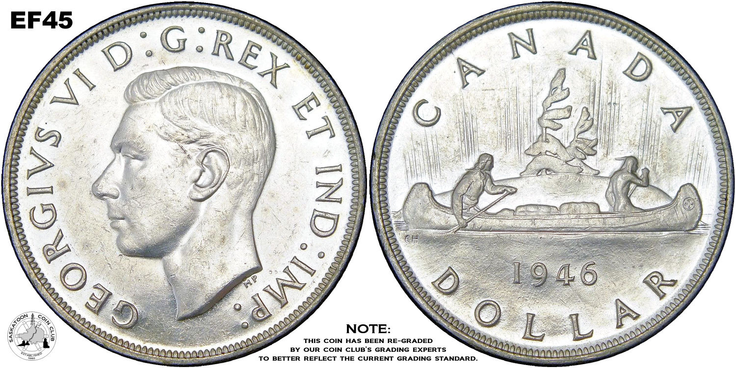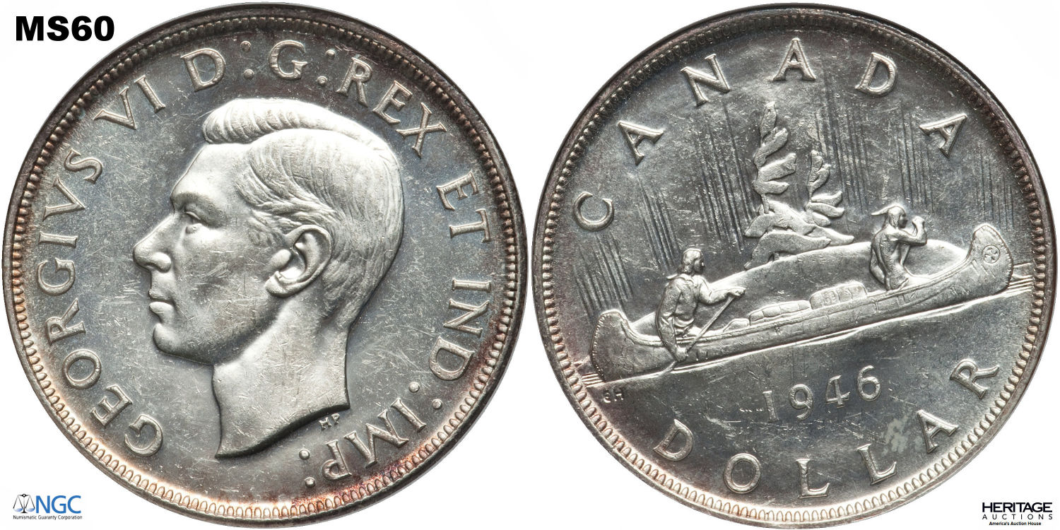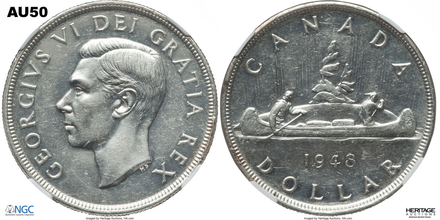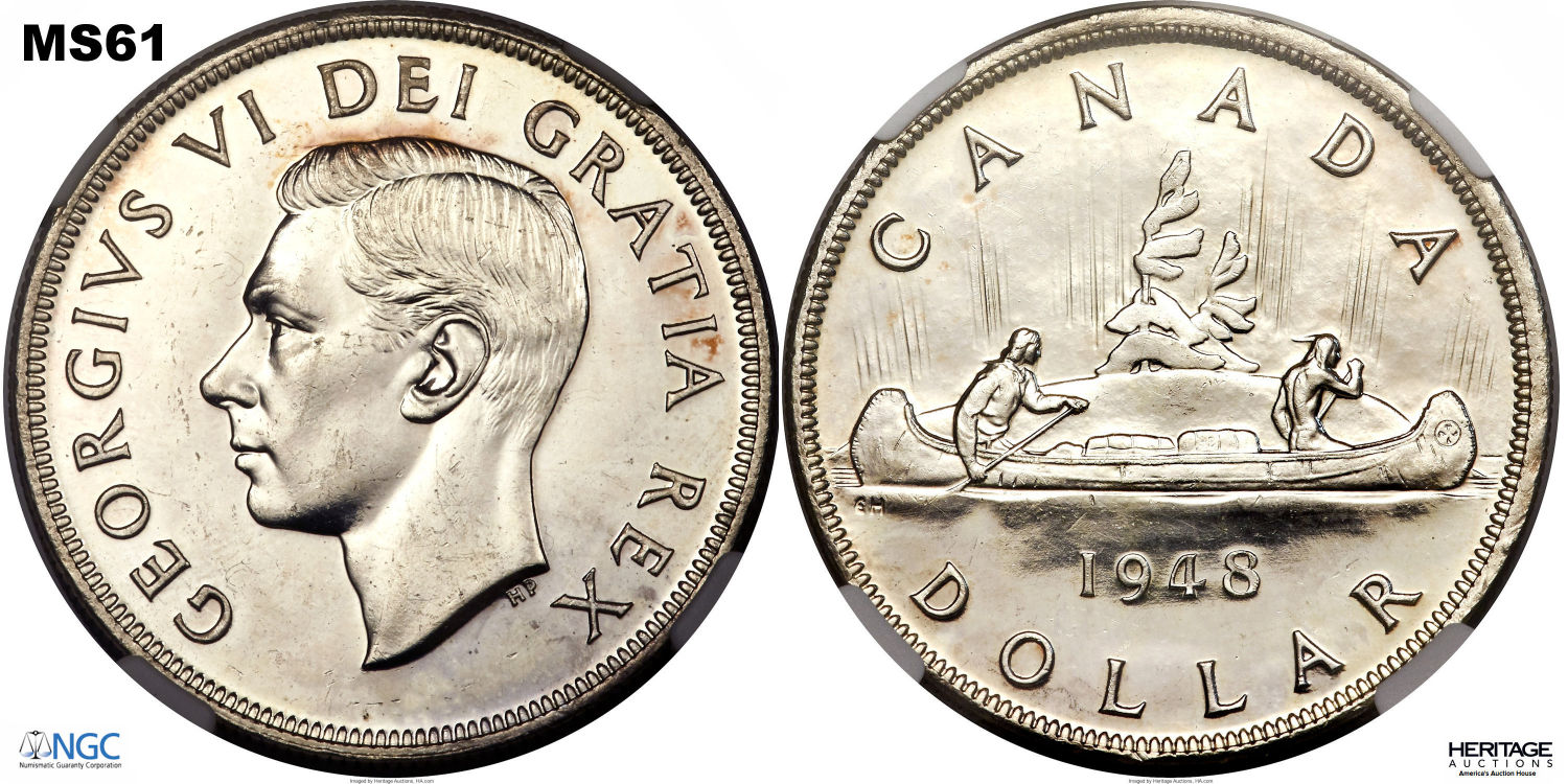 This page describes the criteria used to assign grades to 1 dollar Canadian circulation coins which use the portrait of King George VI, issued between 1937 and 1952. It also shows sample images of each grade. All photos used here were taken of coins that have been professionally graded by companies like PCGS, NGC, ICCS, CCCS, ANACS, or ICG. NOTE: Click on any photo to load a much larger version of both the obverse and reverse sides of the graded coin. Once that photo has loaded on screen, if you click it again you will see a huge photo which allows you to see every fine detail. |