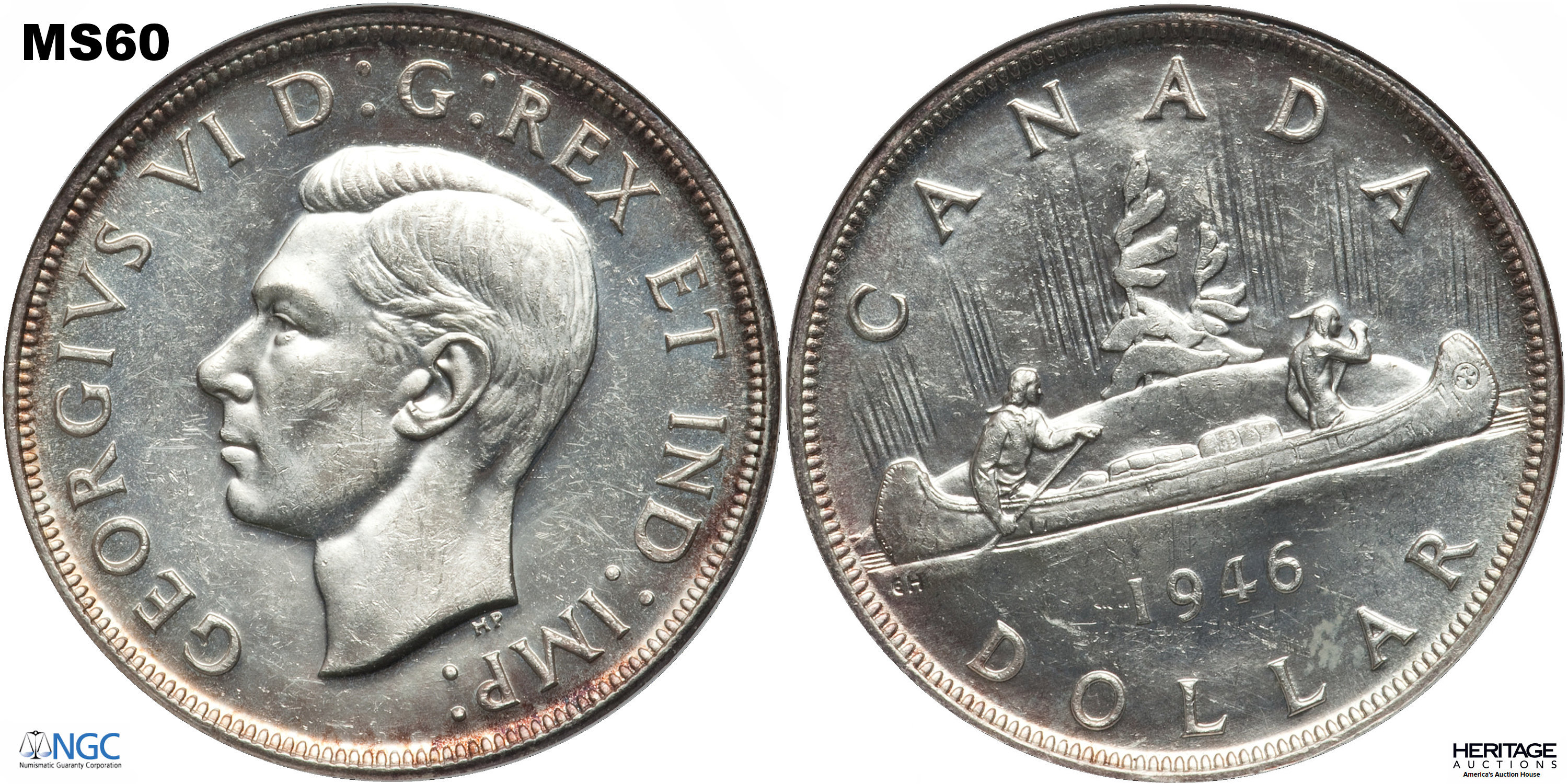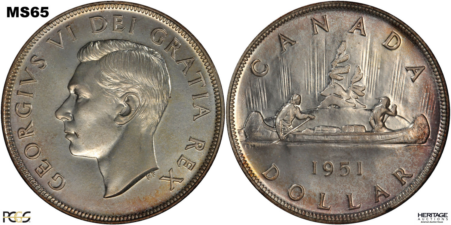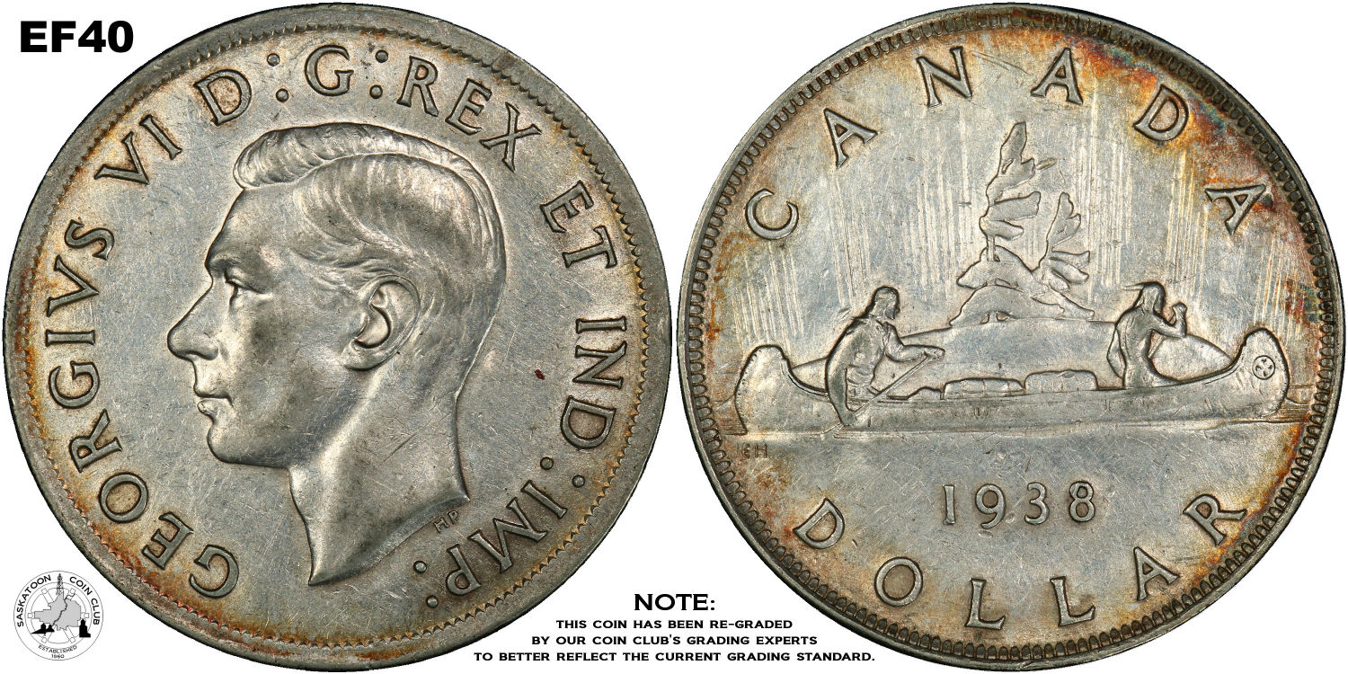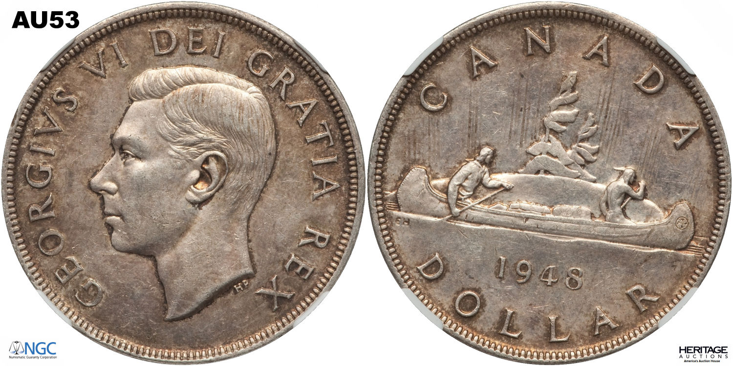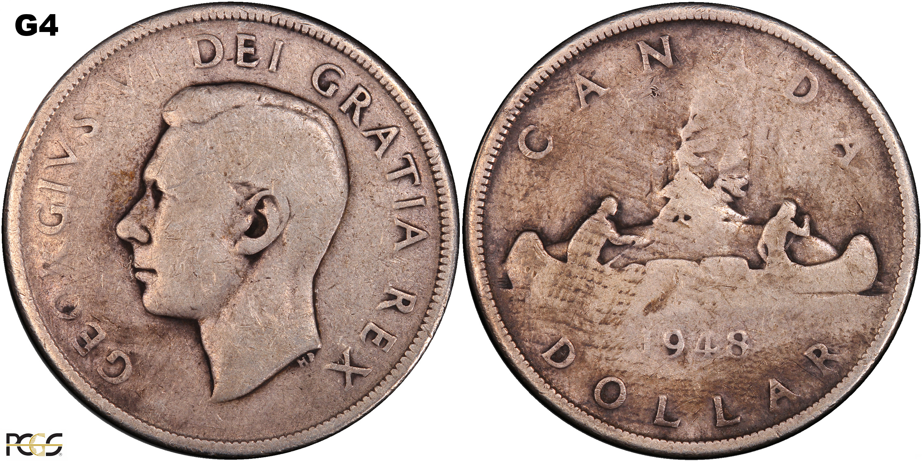 This page describes the criteria used to assign grades to 1 dollar Canadian circulation coins which use the portrait of King George VI, issued between 1937 and 1952. It also shows sample images of each grade. All photos used here were taken of coins that have been professionally graded by companies like PCGS, NGC, ICCS, CCCS, ANACS, or ICG. NOTE: Click on any photo to load a much larger version of both the obverse and reverse sides of the graded coin. Once that photo has loaded on screen, if you click it again you will see a huge photo which allows you to see every fine detail. |