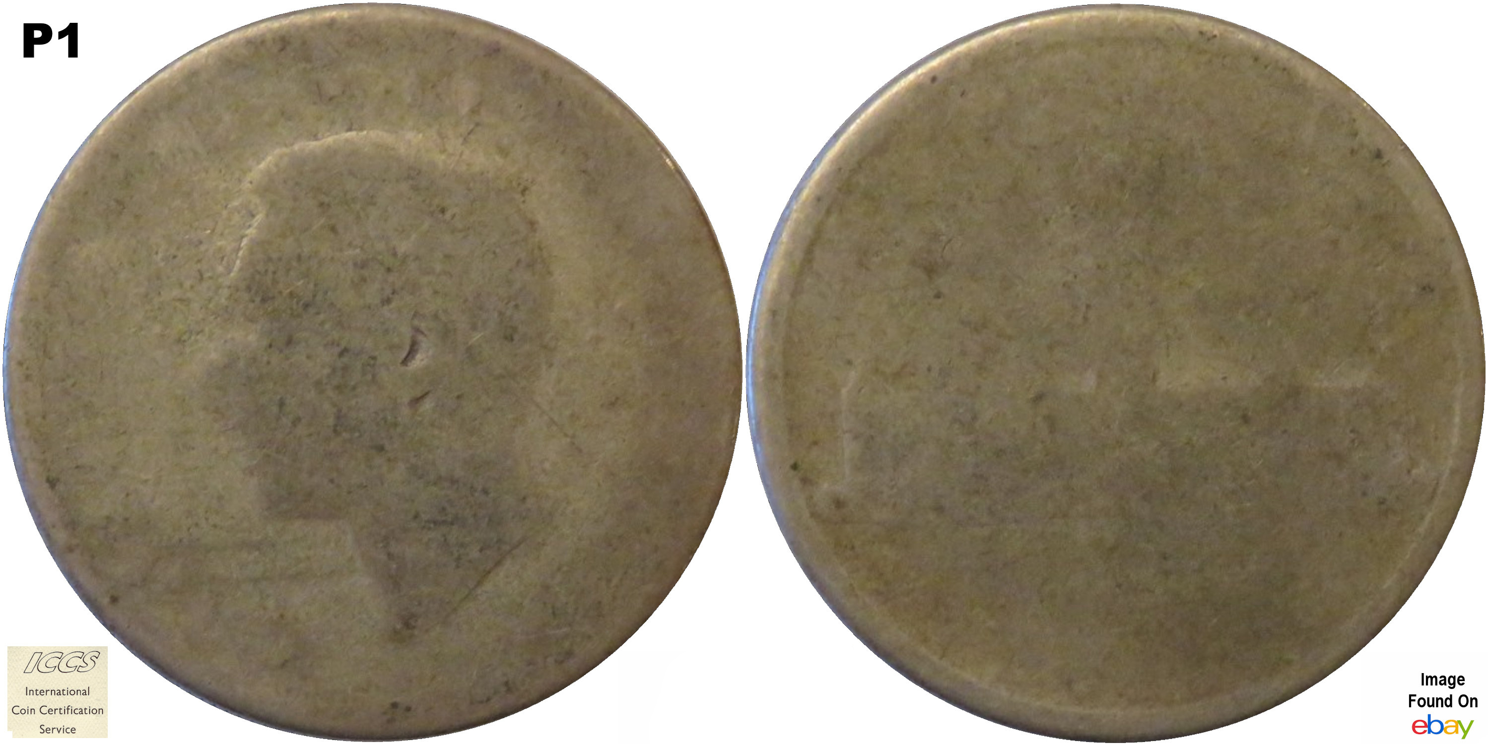 P-1 (Poor 1)- All that is showing is a silhouette. You might not even see the entire outline of the portrait. - Most, if not all, of the rim has worn completely flat. - Most of the lettering around the rim has partially or completely worn off. - You may not be able to determine the date, but should be able to determine the denomination by the outline of the portrait, the diameter, approximate weight and type of metal of the coin. At this grade the weight may not be a match to the specifications because so much of the metal has worn away. |